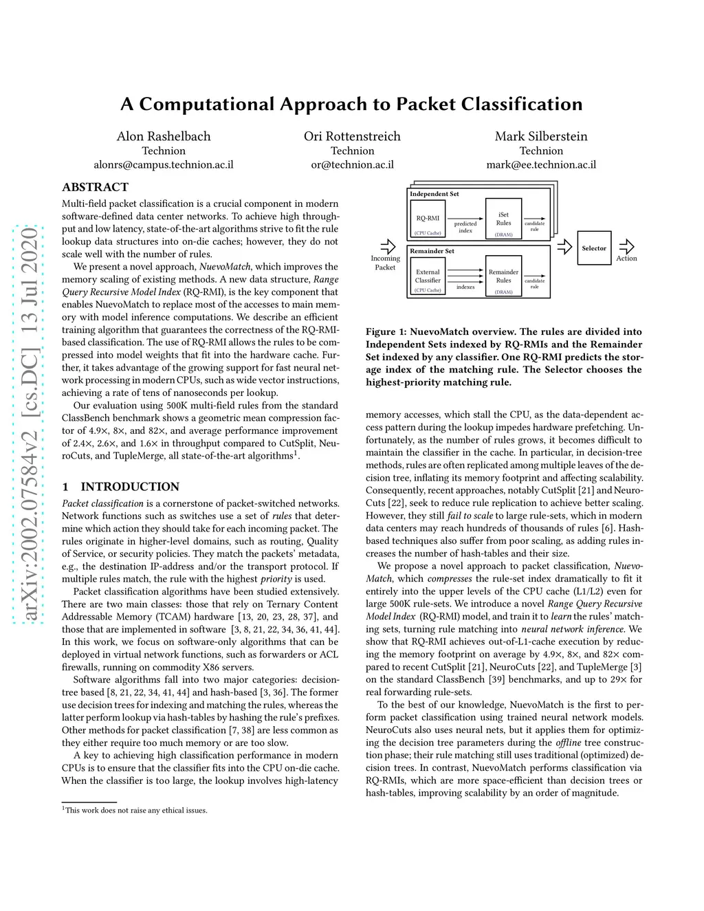Multi-field packet classification is a crucial component in modern software-defined data center networks. To achieve high throughput and low latency, state-of-the-art algorithms strive to fit the rule lookup data structures into on-die caches; however, they do not scale well with the number of rules. We present a novel approach, NuevoMatch, which improves the memory scaling of existing methods. A new data structure, Range Query Recursive Model Index (RQ-RMI), is the key component that enables NuevoMatch to replace most of the accesses to main memory with model inference computations. We describe an efficient training algorithm which guarantees the correctness of the RQ-RMI-based classification. The use of RQ-RMI allows the packet rules to be compressed into model weights that fit into the hardware cache and takes advantage of the growing support for fast neural network processing in modern CPUs, such as wide vector processing engines, achieving a rate of tens of nanoseconds per lookup. Our evaluation using 500K multi-field rules from the standard ClassBench benchmark shows a geomean compression factor of 4.9X, 8X, and 82X, and an average performance improvement of 2.7X, 4.4X and 2.6X in latency and 1.3X, 2.2X, and 1.2X in throughput compared to CutSplit, NeuroCuts, and TupleMerge, all state-of-the-art algorithms.