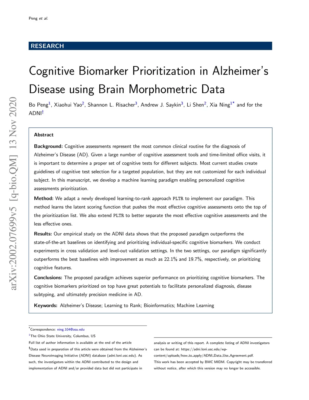 Cognitive Biomarker Prioritization in Alzheimer's Disease using Brain