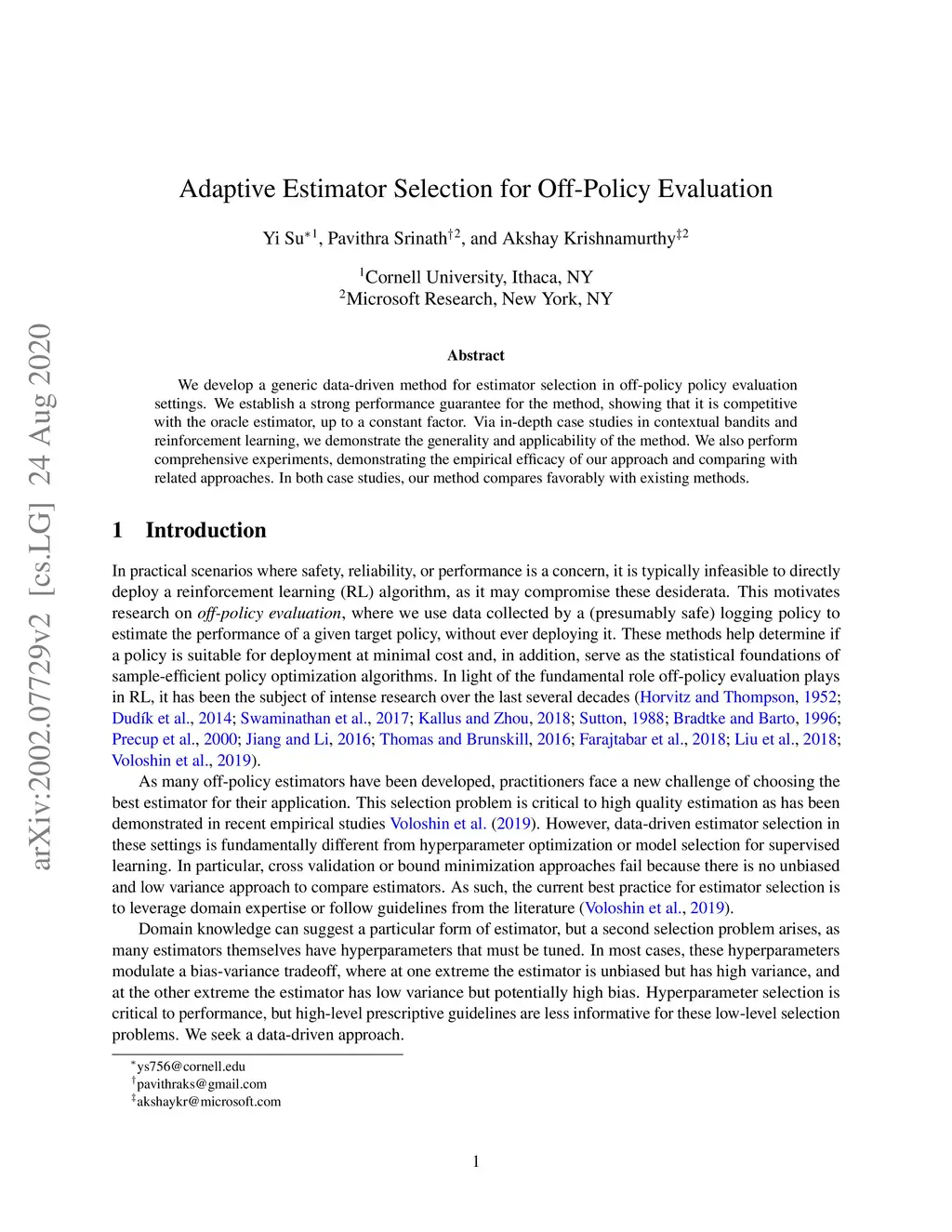 We develop a generic data-driven method for estimator selection in off-policy policy evaluation settings. We establish a strong performance guarantee for the method, showing that it is competitive with the oracle estimator, up to a constant factor. Via in-depth case studies in contextual bandits and reinforcement learning, we demonstrate the generality and applicability of the method. We also perform comprehensive experiments, demonstrating the empirical efficacy of our approach and comparing with related approaches. In both case studies, our method compares favorably with existing methods.