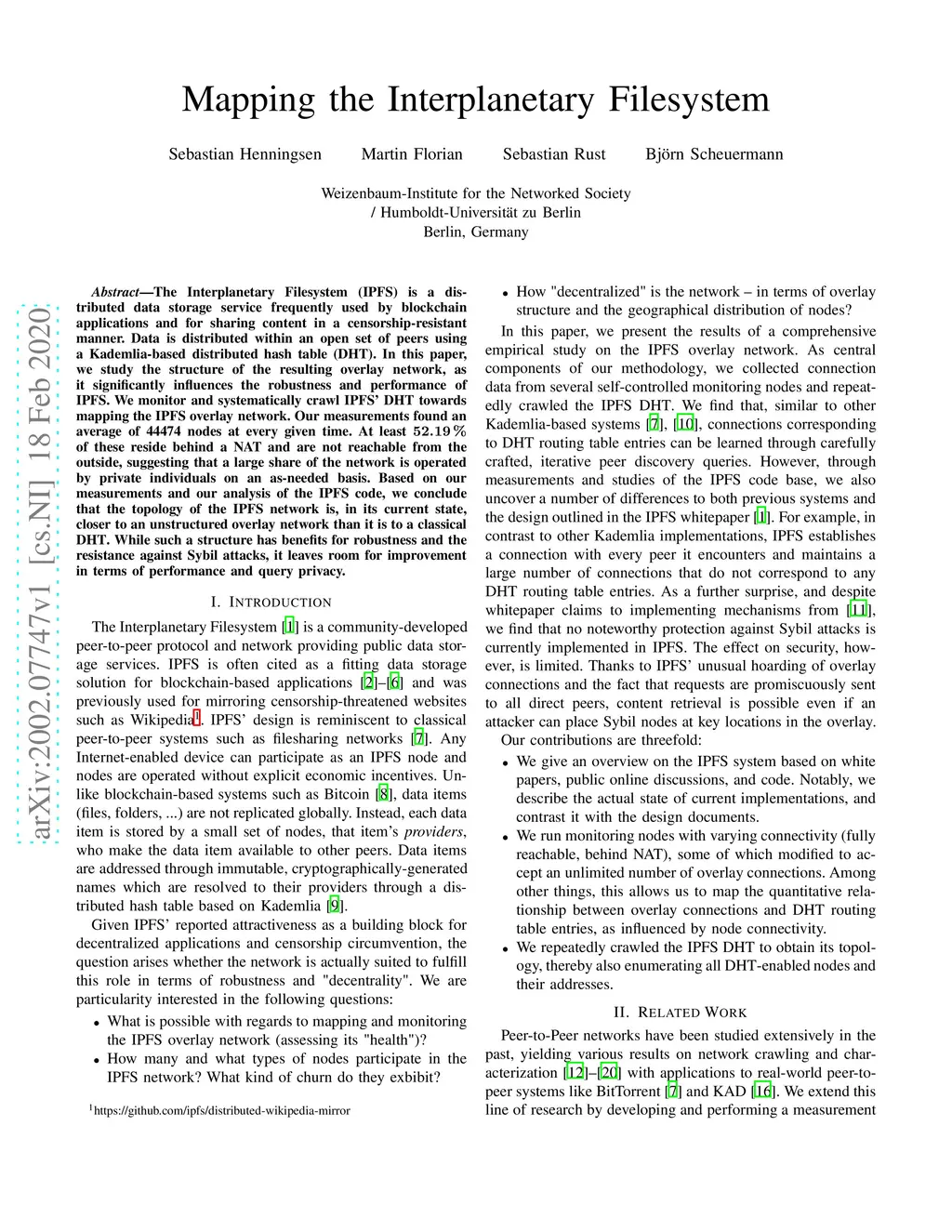 The Interplanetary Filesystem (IPFS) is a distributed data storage service frequently used by blockchain applications and for sharing content in a censorship-resistant manner. Data is distributed within an open set of peers using a Kademlia-based distributed hash table (DHT). In this paper, we study the structure of the resulting overlay network, as it significantly influences the robustness and performance of IPFS. We monitor and systematically crawl IPFS' DHT towards mapping the IPFS overlay network. Our measurements found an average of 44474 nodes at every given time. At least 52.19% of these reside behind a NAT and are not reachable from the outside, suggesting that a large share of the network is operated by private individuals on an as-needed basis. Based on our measurements and our analysis of the IPFS code, we conclude that the topology of the IPFS network is, in its current state, closer to an unstructured overlay network than it is to a classical DHT. While such a structure has benefits for robustness and the resistance against Sybil attacks, it leaves room for improvement in terms of performance and query privacy.