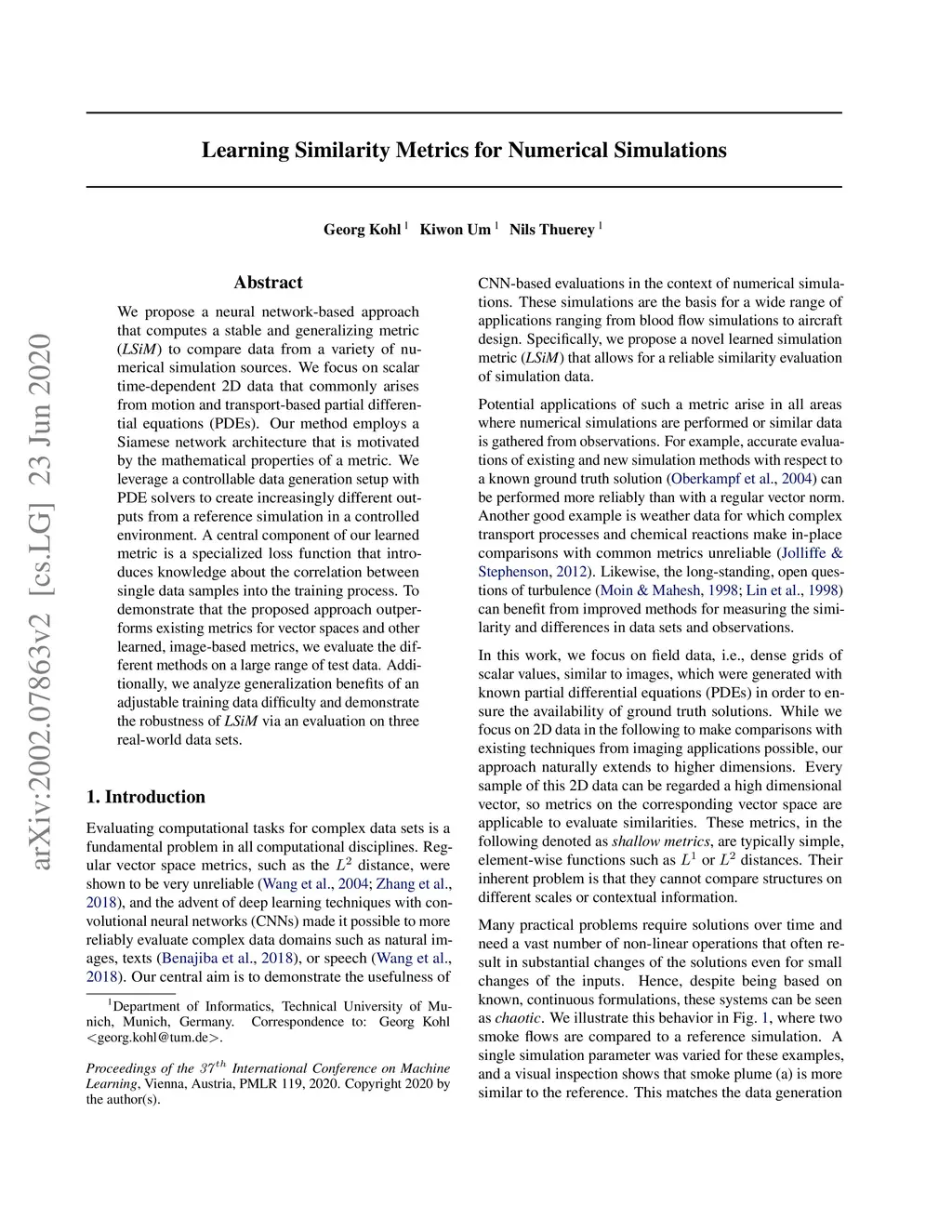We propose a neural network-based approach that computes a stable and generalizing metric (LSiM) to compare data from a variety of numerical simulation sources. We focus on scalar time-dependent 2D data that commonly arises from motion and transport-based partial differential equations (PDEs). Our method employs a Siamese network architecture that is motivated by the mathematical properties of a metric. We leverage a controllable data generation setup with PDE solvers to create increasingly different outputs from a reference simulation in a controlled environment. A central component of our learned metric is a specialized loss function that introduces knowledge about the correlation between single data samples into the training process. To demonstrate that the proposed approach outperforms existing metrics for vector spaces and other learned, image-based metrics, we evaluate the different methods on a large range of test data. Additionally, we analyze generalization benefits of an adjustable training data difficulty and demonstrate the robustness of LSiM via an evaluation on three real-world data sets.