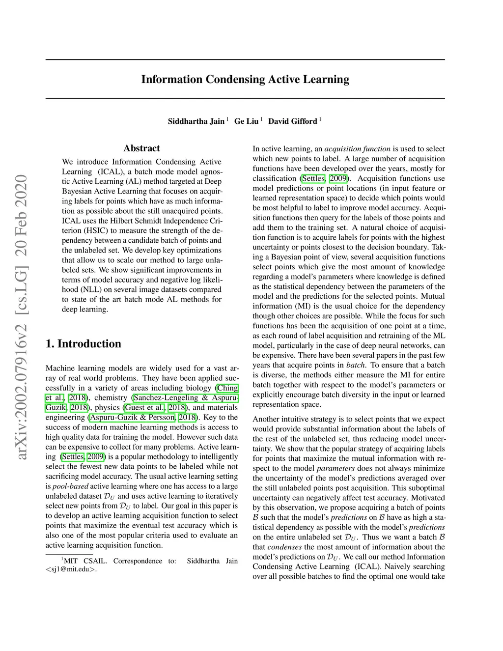 We introduce Information Condensing Active Learning (ICAL), a batch mode model agnostic Active Learning (AL) method targeted at Deep Bayesian Active Learning that focuses on acquiring labels for points which have as much information as possible about the still unacquired points. ICAL uses the Hilbert Schmidt Independence Criterion (HSIC) to measure the strength of the dependency between a candidate batch of points and the unlabeled set. We develop key optimizations that allow us to scale our method to large unlabeled sets. We show significant improvements in terms of model accuracy and negative log likelihood (NLL) on several image datasets compared to state of the art batch mode AL methods for deep learning.