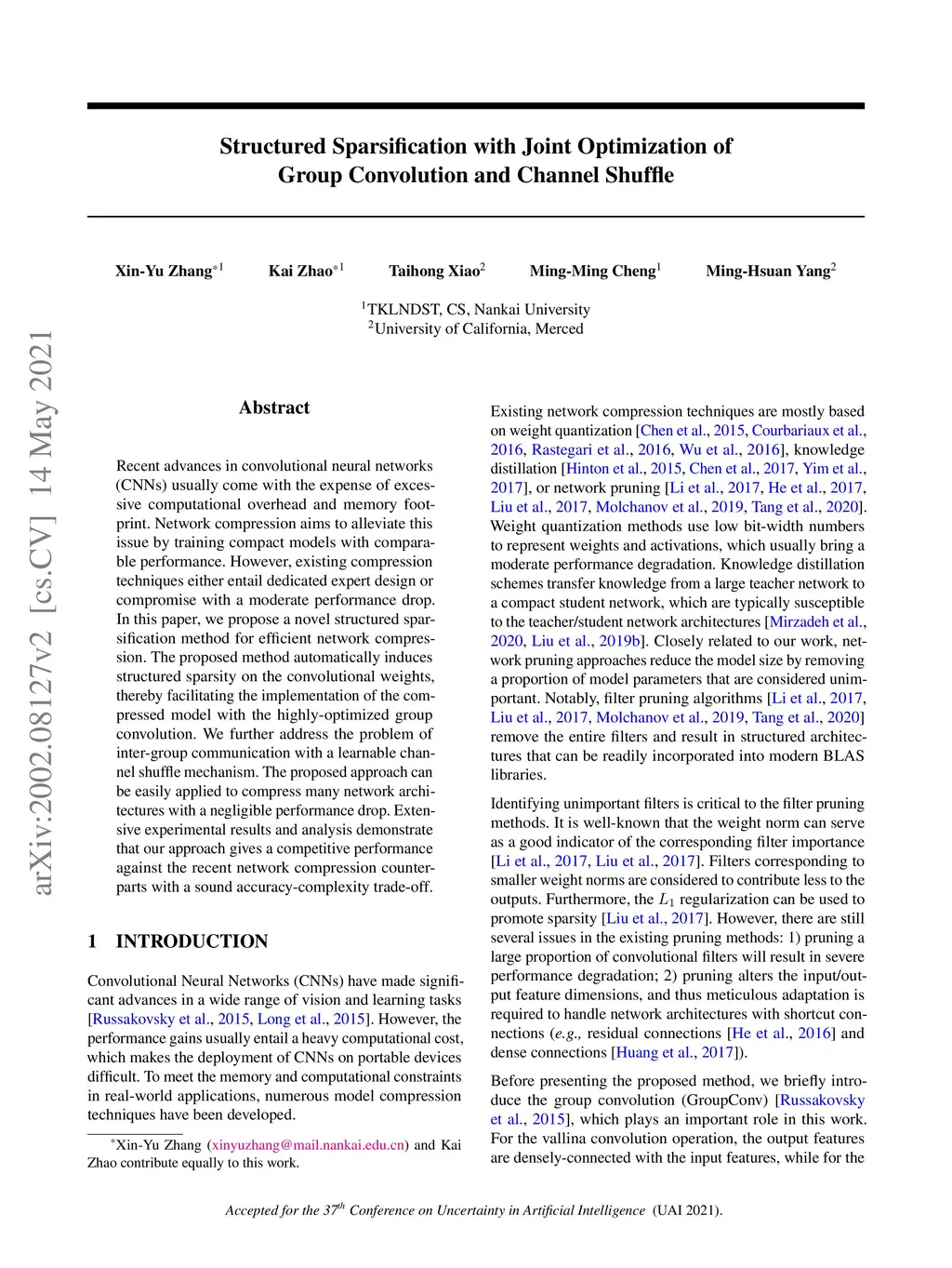 Recent advances in convolutional neural networks(CNNs) usually come with the expense of excessive computational overhead and memory footprint. Network compression aims to alleviate this issue by training compact models with comparable performance. However, existing compression techniques either entail dedicated expert design or compromise with a moderate performance drop. In this paper, we propose a novel structured sparsification method for efficient network compression. The proposed method automatically induces structured sparsity on the convolutional weights, thereby facilitating the implementation of the compressed model with the highly-optimized group convolution. We further address the problem of inter-group communication with a learnable channel shuffle mechanism. The proposed approach can be easily applied to compress many network architectures with a negligible performance drop. Extensive experimental results and analysis demonstrate that our approach gives a competitive performance against the recent network compression counterparts with a sound accuracy-complexity trade-off.