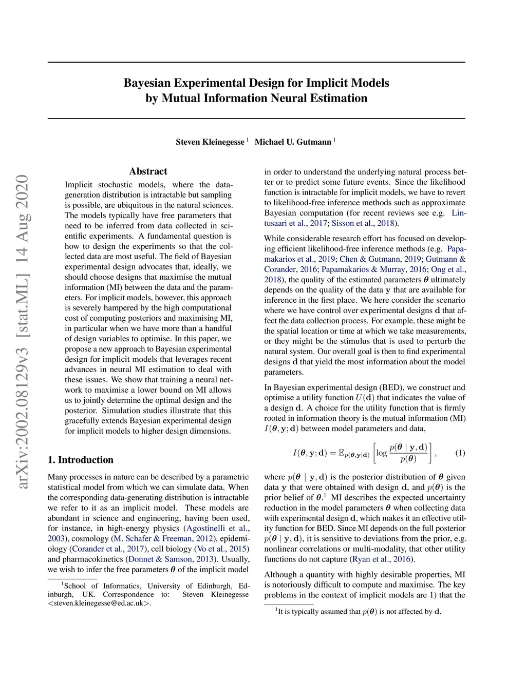 Bayesian Experimental Design for Implicit Models by Mutual Information