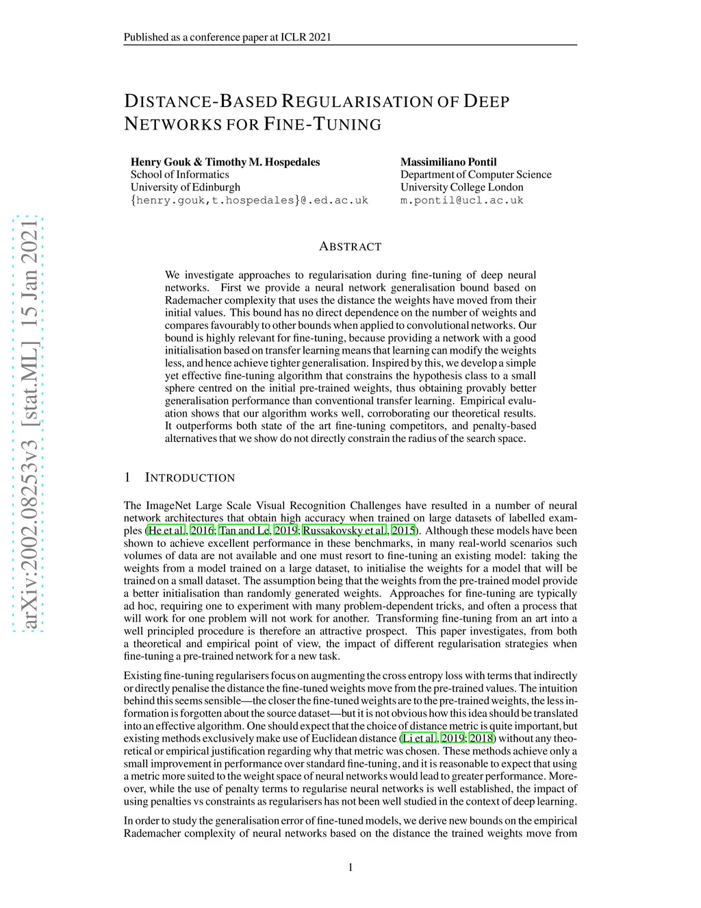We investigate approaches to regularisation during fine-tuning of deep neural networks. First we provide a neural network generalisation bound based on Rademacher complexity that uses the distance the weights have moved from their initial values. This bound has no direct dependence on the number of weights and compares favourably to other bounds when applied to convolutional networks. Our bound is highly relevant for fine-tuning, because providing a network with a good initialisation based on transfer learning means that learning can modify the weights less, and hence achieve tighter generalisation. Inspired by this, we develop a simple yet effective fine-tuning algorithm that constrains the hypothesis class to a small sphere centred on the initial pre-trained weights, thus obtaining provably better generalisation performance than conventional transfer learning. Empirical evaluation shows that our algorithm works well, corroborating our theoretical results. It outperforms both state of the art fine-tuning competitors, and penalty-based alternatives that we show do not directly constrain the radius of the search space.