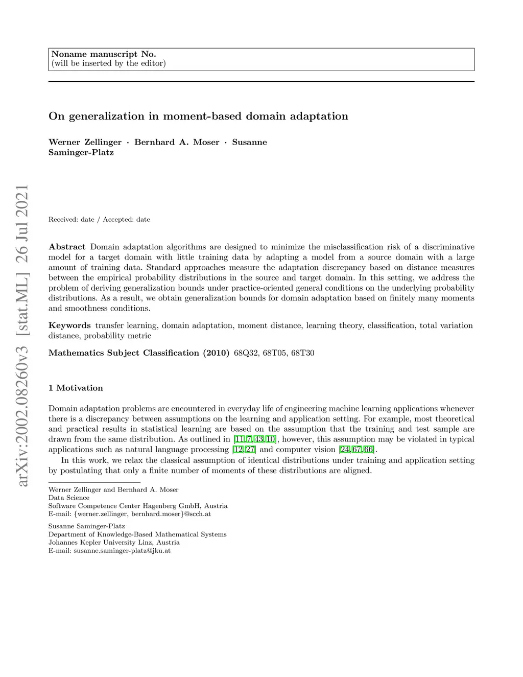 Domain adaptation algorithms are designed to minimize the misclassification risk of a discriminative model for a target domain with little training data by adapting a model from a source domain with a large amount of training data. Standard approaches measure the adaptation discrepancy based on distance measures between the empirical probability distributions in the source and target domain. In this setting, we address the problem of deriving generalization bounds under practice-oriented general conditions on the underlying probability distributions. As a result, we obtain generalization bounds for domain adaptation based on finitely many moments and smoothness conditions.