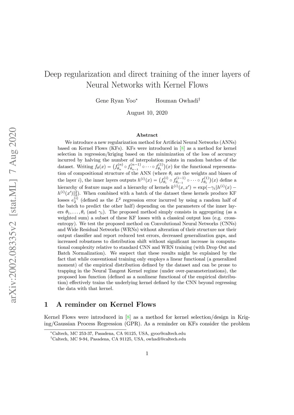 We introduce a new regularization method for Artificial Neural Networks (ANNs) based on Kernel Flows (KFs). KFs were introduced as a method for kernel selection in regression/kriging based on the minimization of the loss of accuracy incurred by halving the number of interpolation points in random batches of the dataset. Writing for the functional representation of compositional structure of the ANN, the inner layers outputs define a hierarchy of feature maps and kernels . When combined with a batch of the dataset these kernels produce KF losses (the regression error incurred by using a random half of the batch to predict the other half) depending on parameters of inner layers (and ). The proposed method simply consists in aggregating a subset of these KF losses with a classical output loss. We test the proposed method on CNNs and WRNs without alteration of structure nor output classifier and report reduced test errors, decreased generalization gaps, and increased robustness to distribution shift without significant increase in computational complexity. We suspect that these results might be explained by the fact that while conventional training only employs a linear functional (a generalized moment) of the empirical distribution defined by the dataset and can be prone to trapping in the Neural Tangent Kernel regime (under over-parameterizations), the proposed loss function (defined as a nonlinear functional of the empirical distribution) effectively trains the underlying kernel defined by the CNN beyond regressing the data with that kernel.