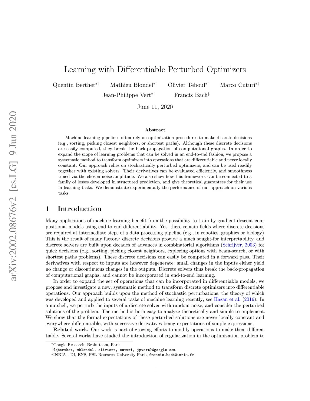 Machine learning pipelines often rely on optimization procedures to make discrete decisions (e.g., sorting, picking closest neighbors, or shortest paths). Although these discrete decisions are easily computed, they break the back-propagation of computational graphs. In order to expand the scope of learning problems that can be solved in an end-to-end fashion, we propose a systematic method to transform optimizers into operations that are differentiable and never locally constant. Our approach relies on stochastically perturbed optimizers, and can be used readily together with existing solvers. Their derivatives can be evaluated efficiently, and smoothness tuned via the chosen noise amplitude. We also show how this framework can be connected to a family of losses developed in structured prediction, and give theoretical guarantees for their use in learning tasks. We demonstrate experimentally the performance of our approach on various tasks.
