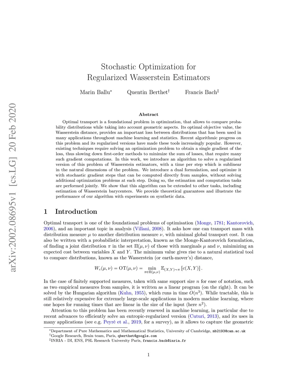 Optimal transport is a foundational problem in optimization, that allows to compare probability distributions while taking into account geometric aspects. Its optimal objective value, the Wasserstein distance, provides an important loss between distributions that has been used in many applications throughout machine learning and statistics. Recent algorithmic progress on this problem and its regularized versions have made these tools increasingly popular. However, existing techniques require solving an optimization problem to obtain a single gradient of the loss, thus slowing down first-order methods to minimize the sum of losses, that require many such gradient computations. In this work, we introduce an algorithm to solve a regularized version of this problem of Wasserstein estimators, with a time per step which is sublinear in the natural dimensions of the problem. We introduce a dual formulation, and optimize it with stochastic gradient steps that can be computed directly from samples, without solving additional optimization problems at each step. Doing so, the estimation and computation tasks are performed jointly. We show that this algorithm can be extended to other tasks, including estimation of Wasserstein barycenters. We provide theoretical guarantees and illustrate the performance of our algorithm with experiments on synthetic data.