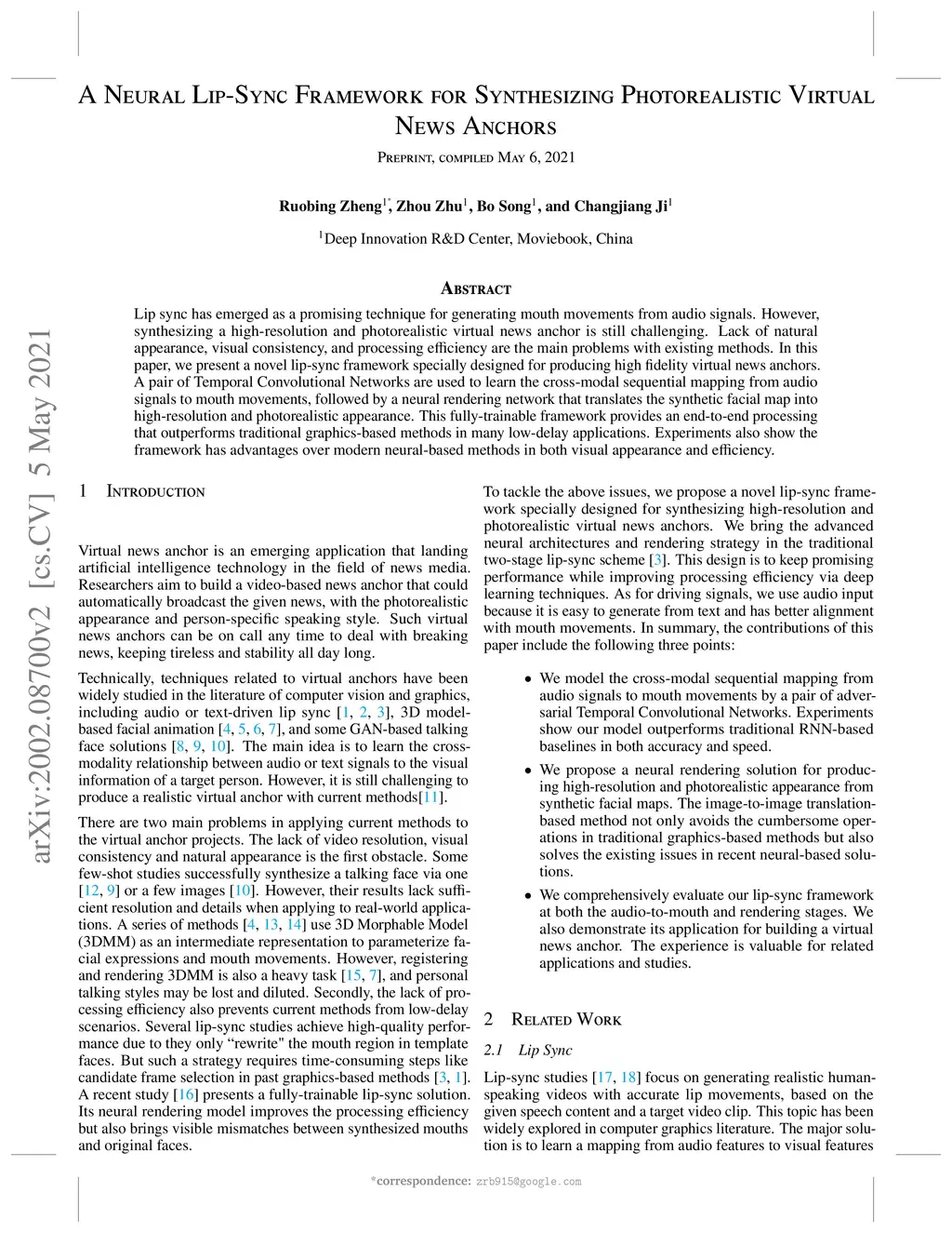 Lip sync has emerged as a promising technique for generating mouth movements from audio signals. However, synthesizing a high-resolution and photorealistic virtual news anchor is still challenging. Lack of natural appearance, visual consistency, and processing efficiency are the main problems with existing methods. This paper presents a novel lip-sync framework specially designed for producing high-fidelity virtual news anchors. A pair of Temporal Convolutional Networks are used to learn the cross-modal sequential mapping from audio signals to mouth movements, followed by a neural rendering network that translates the synthetic facial map into a high-resolution and photorealistic appearance. This fully trainable framework provides end-to-end processing that outperforms traditional graphics-based methods in many low-delay applications. Experiments also show the framework has advantages over modern neural-based methods in both visual appearance and efficiency.