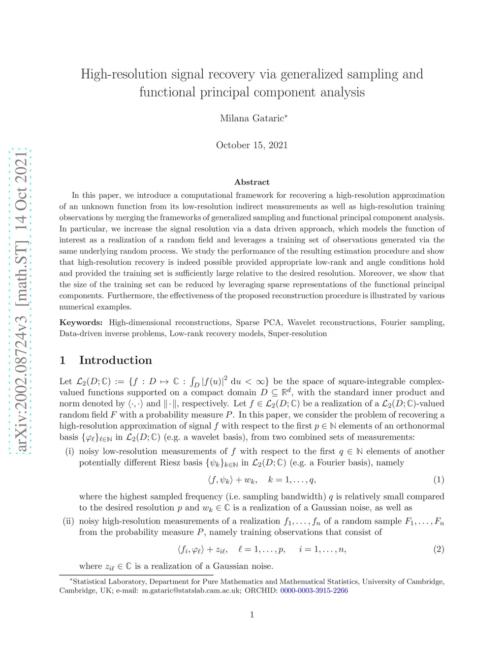 In this paper, we introduce a computational framework for recovering a high-resolution approximation of an unknown function from its low-resolution indirect measurements as well as high-resolution training observations by merging the frameworks of generalized sampling and functional principal component analysis. In particular, we increase the signal resolution via a data driven approach, which models the function of interest as a realization of a random field and leverages a training set of observations generated via the same underlying random process. We study the performance of the resulting estimation procedure and show that high-resolution recovery is indeed possible provided appropriate low-rank and angle conditions hold and provided the training set is sufficiently large relative to the desired resolution. Moreover, we show that the size of the training set can be reduced by leveraging sparse representations of the functional principal components. Furthermore, the effectiveness of the proposed reconstruction procedure is illustrated by various numerical examples.