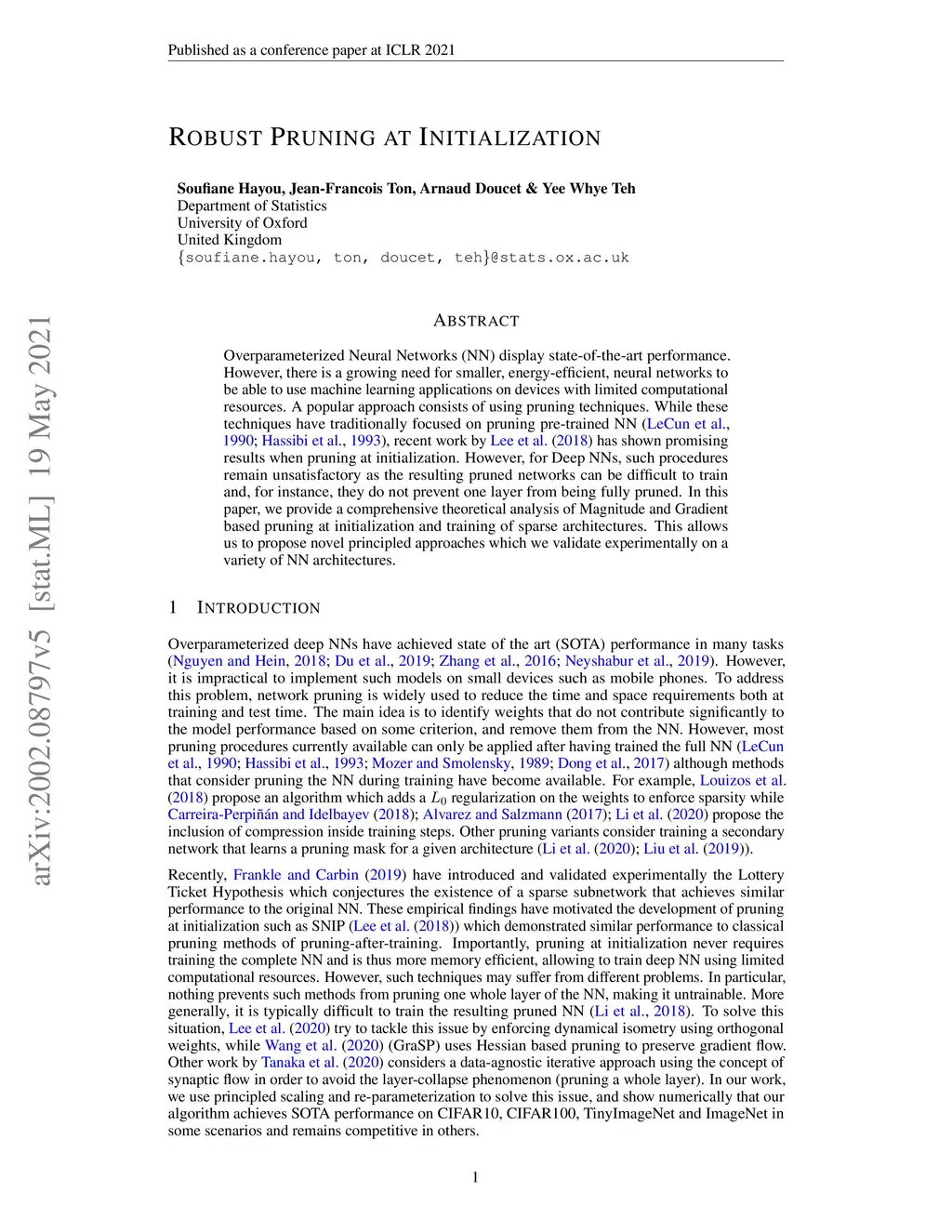 Overparameterized Neural Networks (NN) display state-of-the-art performance. However, there is a growing need for smaller, energy-efficient, neural networks tobe able to use machine learning applications on devices with limited computational resources. A popular approach consists of using pruning techniques. While these techniques have traditionally focused on pruning pre-trained NN (LeCun et al.,1990; Hassibi et al., 1993), recent work by Lee et al. (2018) has shown promising results when pruning at initialization. However, for Deep NNs, such procedures remain unsatisfactory as the resulting pruned networks can be difficult to train and, for instance, they do not prevent one layer from being fully pruned. In this paper, we provide a comprehensive theoretical analysis of Magnitude and Gradient based pruning at initialization and training of sparse architectures. This allows us to propose novel principled approaches which we validate experimentally on a variety of NN architectures.