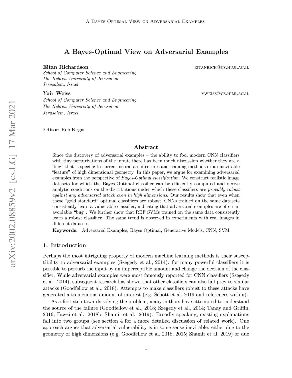 Since the discovery of adversarial examples - the ability to fool modern CNN classifiers with tiny perturbations of the input, there has been much discussion whether they are a "bug" that is specific to current neural architectures and training methods or an inevitable "feature" of high dimensional geometry. In this paper, we argue for examining adversarial examples from the perspective of Bayes-Optimal classification. We construct realistic image datasets for which the Bayes-Optimal classifier can be efficiently computed and derive analytic conditions on the distributions under which these classifiers are provably robust against any adversarial attack even in high dimensions. Our results show that even when these "gold standard" optimal classifiers are robust, CNNs trained on the same datasets consistently learn a vulnerable classifier, indicating that adversarial examples are often an avoidable "bug". We further show that RBF SVMs trained on the same data consistently learn a robust classifier. The same trend is observed in experiments with real images in different datasets.