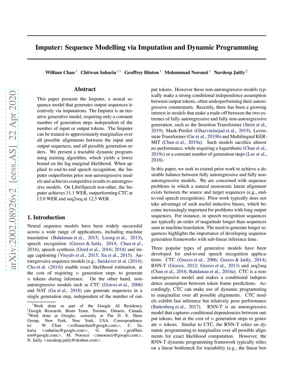 This paper presents the Imputer, a neural sequence model that generates output sequences iteratively via imputations. The Imputer is an iterative generative model, requiring only a constant number of generation steps independent of the number of input or output tokens. The Imputer can be trained to approximately marginalize over all possible alignments between the input and output sequences, and all possible generation orders. We present a tractable dynamic programming training algorithm, which yields a lower bound on the log marginal likelihood. When applied to end-to-end speech recognition, the Imputer outperforms prior non-autoregressive models and achieves competitive results to autoregressive models. On LibriSpeech test-other, the Imputer achieves 11.1 WER, outperforming CTC at 13.0 WER and seq2seq at 12.5 WER.
