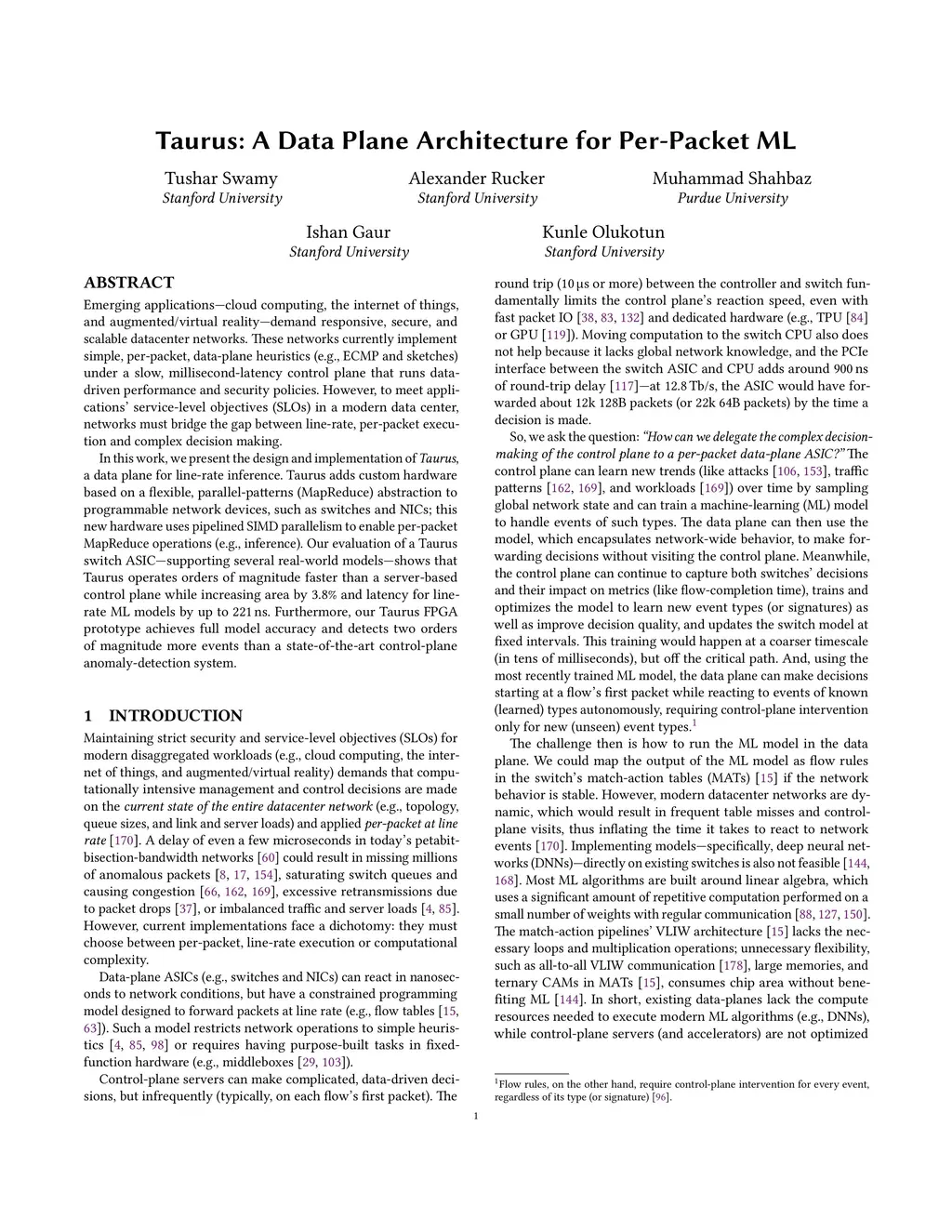 Taurus: A Data Plane Architecture for Per-Packet ML