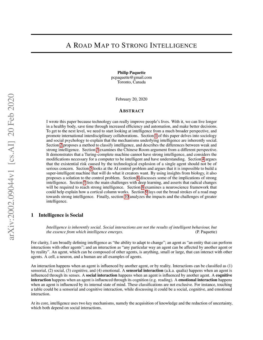 I wrote this paper because technology can really improve people's lives. With it, we can live longer in a healthy body, save time through increased efficiency and automation, and make better decisions. To get to the next level, we need to start looking at intelligence from a much broader perspective, and promote international interdisciplinary collaborations. Section 1 of this paper delves into sociology and social psychology to explain that the mechanisms underlying intelligence are inherently social. Section 2 proposes a method to classify intelligence, and describes the differences between weak and strong intelligence. Section 3 examines the Chinese Room argument from a different perspective. It demonstrates that a Turing-complete machine cannot have strong intelligence, and considers the modifications necessary for a computer to be intelligent and have understanding. Section 4 argues that the existential risk caused by the technological explosion of a single agent should not be of serious concern. Section 5 looks at the AI control problem and argues that it is impossible to build a super-intelligent machine that will do what it creators want. By using insights from biology, it also proposes a solution to the control problem. Section 6 discusses some of the implications of strong intelligence. Section 7 lists the main challenges with deep learning, and asserts that radical changes will be required to reach strong intelligence. Section 8 examines a neuroscience framework that could help explain how a cortical column works. Section 9 lays out the broad strokes of a road map towards strong intelligence. Finally, section 10 analyzes the impacts and the challenges of greater intelligence.