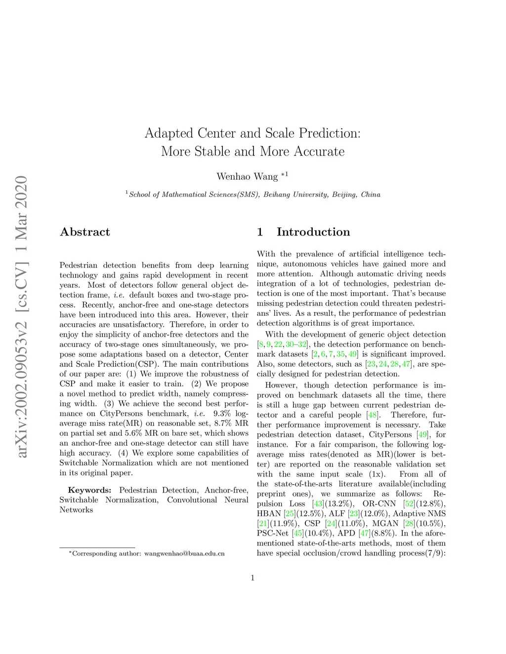 Pedestrian detection benefits from deep learning technology and gains rapid development in recent years. Most of detectors follow general object detection frame, i.e. default boxes and two-stage process. Recently, anchor-free and one-stage detectors have been introduced into this area. However, their accuracies are unsatisfactory. Therefore, in order to enjoy the simplicity of anchor-free detectors and the accuracy of two-stage ones simultaneously, we propose some adaptations based on a detector, Center and Scale Prediction(CSP). The main contributions of our paper are: (1) We improve the robustness of CSP and make it easier to train. (2) We propose a novel method to predict width, namely compressing width. (3) We achieve the second best performance on CityPersons benchmark, i.e. 9.3% log-average miss rate(MR) on reasonable set, 8.7% MR on partial set and 5.6% MR on bare set, which shows an anchor-free and one-stage detector can still have high accuracy. (4) We explore some capabilities of Switchable Normalization which are not mentioned in its original paper.