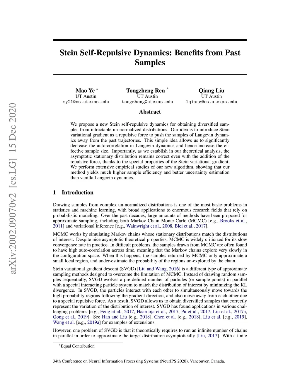 We propose a new Stein self-repulsive dynamics for obtaining diversified samples from intractable un-normalized distributions. Our idea is to introduce Stein variational gradient as a repulsive force to push the samples of Langevin dynamics away from the past trajectories. This simple idea allows us to significantly decrease the auto-correlation in Langevin dynamics and hence increase the effective sample size. Importantly, as we establish in our theoretical analysis, the asymptotic stationary distribution remains correct even with the addition of the repulsive force, thanks to the special properties of the Stein variational gradient. We perform extensive empirical studies of our new algorithm, showing that our method yields much higher sample efficiency and better uncertainty estimation than vanilla Langevin dynamics.