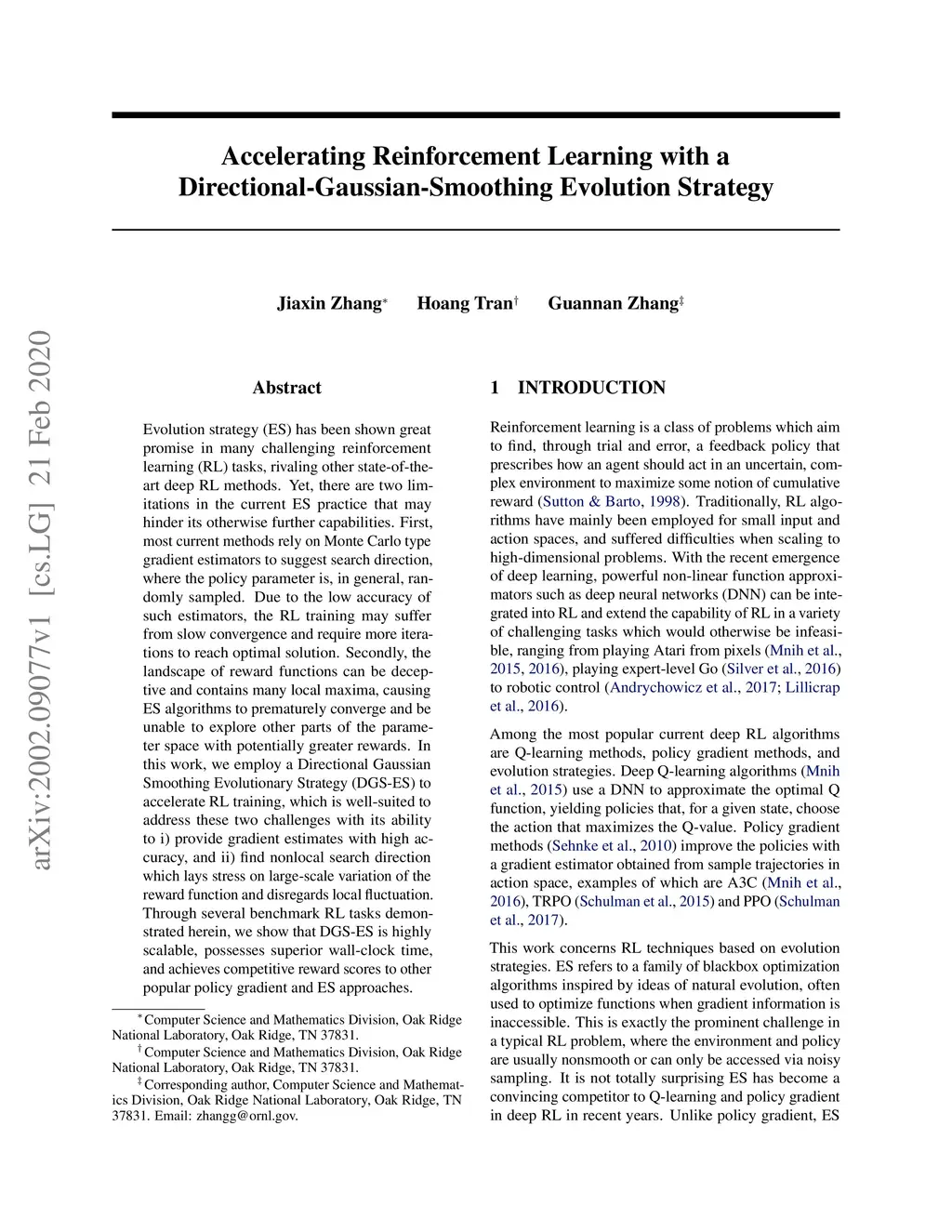 Evolution strategy (ES) has been shown great promise in many challenging reinforcement learning (RL) tasks, rivaling other state-of-the-art deep RL methods. Yet, there are two limitations in the current ES practice that may hinder its otherwise further capabilities. First, most current methods rely on Monte Carlo type gradient estimators to suggest search direction, where the policy parameter is, in general, randomly sampled. Due to the low accuracy of such estimators, the RL training may suffer from slow convergence and require more iterations to reach optimal solution. Secondly, the landscape of reward functions can be deceptive and contains many local maxima, causing ES algorithms to prematurely converge and be unable to explore other parts of the parameter space with potentially greater rewards. In this work, we employ a Directional Gaussian Smoothing Evolutionary Strategy (DGS-ES) to accelerate RL training, which is well-suited to address these two challenges with its ability to i) provide gradient estimates with high accuracy, and ii) find nonlocal search direction which lays stress on large-scale variation of the reward function and disregards local fluctuation. Through several benchmark RL tasks demonstrated herein, we show that DGS-ES is highly scalable, possesses superior wall-clock time, and achieves competitive reward scores to other popular policy gradient and ES approaches.