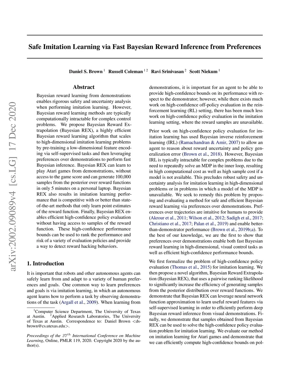 Bayesian reward learning from demonstrations enables rigorous safety and uncertainty analysis when performing imitation learning. However, Bayesian reward learning methods are typically computationally intractable for complex control problems. We propose Bayesian Reward Extrapolation (Bayesian REX), a highly efficient Bayesian reward learning algorithm that scales to high-dimensional imitation learning problems by pre-training a low-dimensional feature encoding via self-supervised tasks and then leveraging preferences over demonstrations to perform fast Bayesian inference. Bayesian REX can learn to play Atari games from demonstrations, without access to the game score and can generate 100,000 samples from the posterior over reward functions in only 5 minutes on a personal laptop. Bayesian REX also results in imitation learning performance that is competitive with or better than state-of-the-art methods that only learn point estimates of the reward function. Finally, Bayesian REX enables efficient high-confidence policy evaluation without having access to samples of the reward function. These high-confidence performance bounds can be used to rank the performance and risk of a variety of evaluation policies and provide a way to detect reward hacking behaviors.