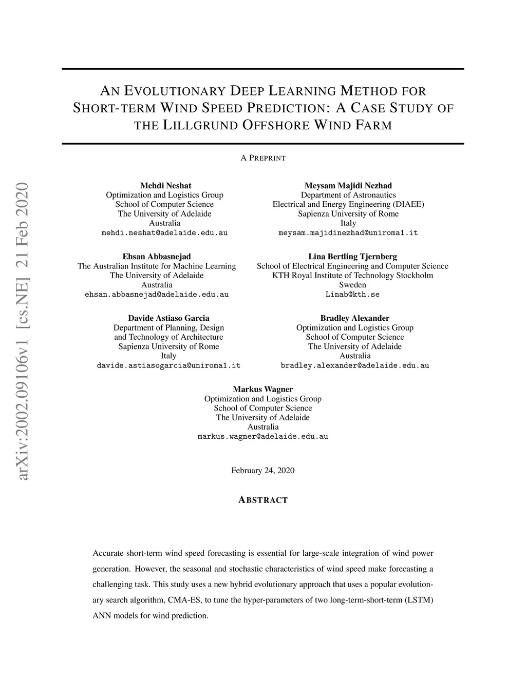 Accurate short-term wind speed forecasting is essential for large-scale integration of wind power generation. However, the seasonal and stochastic characteristics of wind speed make forecasting a challenging task. This study uses a new hybrid evolutionary approach that uses a popular evolutionary search algorithm, CMA-ES, to tune the hyper-parameters of two Long short-term memory(LSTM) ANN models for wind prediction. The proposed hybrid approach is trained on data gathered from an offshore wind turbine installed in a Swedish wind farm located in the Baltic Sea. Two forecasting horizons including ten-minutes ahead (absolute short term) and one-hour ahead (short term) are considered in our experiments. Our experimental results indicate that the new approach is superior to five other applied machine learning models, i.e., polynomial neural network (PNN), feed-forward neural network (FNN), nonlinear autoregressive neural network (NAR) and adaptive neuro-fuzzy inference system (ANFIS), as measured by five performance criteria.