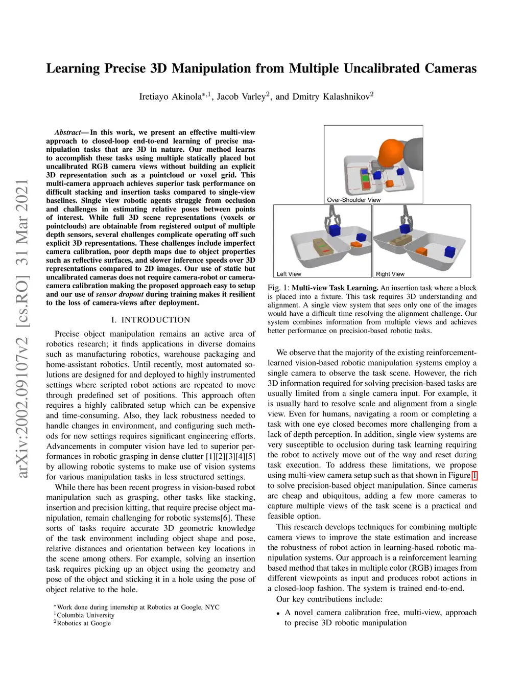 In this work, we present an effective multi-view approach to closed-loop end-to-end learning of precise manipulation tasks that are 3D in nature. Our method learns to accomplish these tasks using multiple statically placed but uncalibrated RGB camera views without building an explicit 3D representation such as a pointcloud or voxel grid. This multi-camera approach achieves superior task performance on difficult stacking and insertion tasks compared to single-view baselines. Single view robotic agents struggle from occlusion and challenges in estimating relative poses between points of interest. While full 3D scene representations (voxels or pointclouds) are obtainable from registered output of multiple depth sensors, several challenges complicate operating off such explicit 3D representations. These challenges include imperfect camera calibration, poor depth maps due to object properties such as reflective surfaces, and slower inference speeds over 3D representations compared to 2D images. Our use of static but uncalibrated cameras does not require camera-robot or camera-camera calibration making the proposed approach easy to setup and our use of \textit{sensor dropout} during training makes it resilient to the loss of camera-views after deployment.