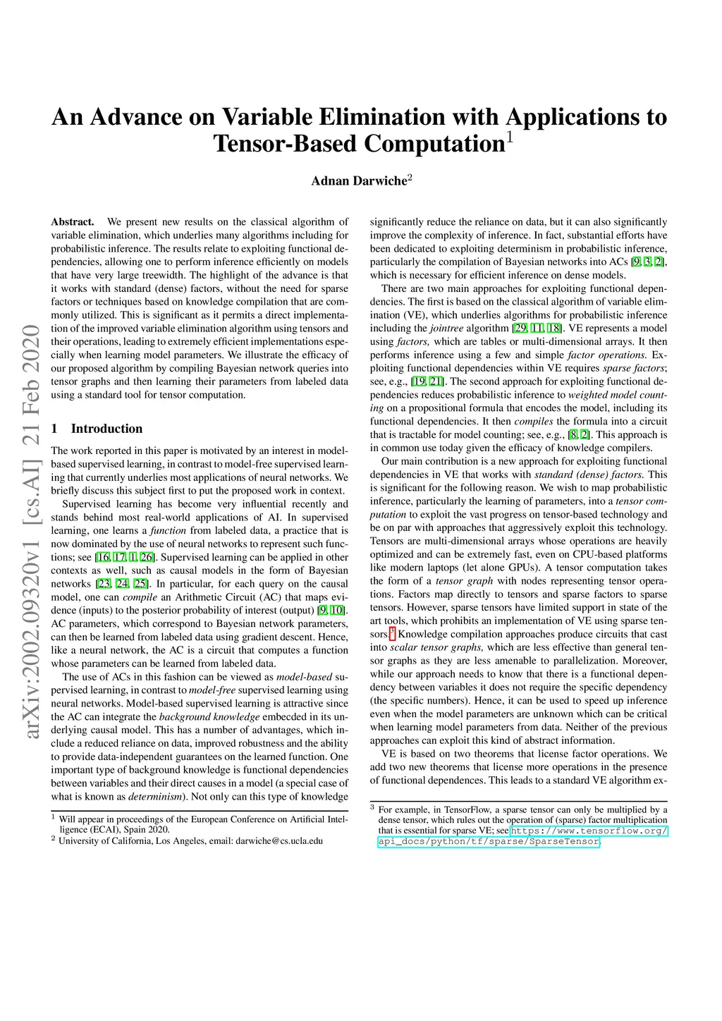 We present new results on the classical algorithm of variable elimination, which underlies many algorithms including for probabilistic inference. The results relate to exploiting functional dependencies, allowing one to perform inference and learning efficiently on models that have very large treewidth. The highlight of the advance is that it works with standard (dense) factors, without the need for sparse factors or techniques based on knowledge compilation that are commonly utilized. This is significant as it permits a direct implementation of the improved variable elimination algorithm using tensors and their operations, leading to extremely efficient implementations especially when learning model parameters. Moreover, the proposed technique does not require knowledge of the specific functional dependencies, only that they exist, so can be used when learning these dependencies. We illustrate the efficacy of our proposed algorithm by compiling Bayesian network queries into tensor graphs and then learning their parameters from labeled data using a standard tool for tensor computation.