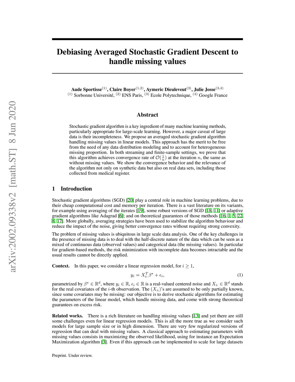 A major caveat of large scale data is their incom-pleteness. We propose an averaged stochastic gradient algorithm handling missing values in linear models. This approach has the merit to be free from the need of any data distribution modeling and to account for heterogeneous missing proportion. In both streaming and finite-sample settings, we prove that this algorithm achieves convergence rate of O(1 n) at the iteration n, the same as without missing values. We show the convergence behavior and the relevance of the algorithm not only on synthetic data but also on real data sets, including those collected from medical register.