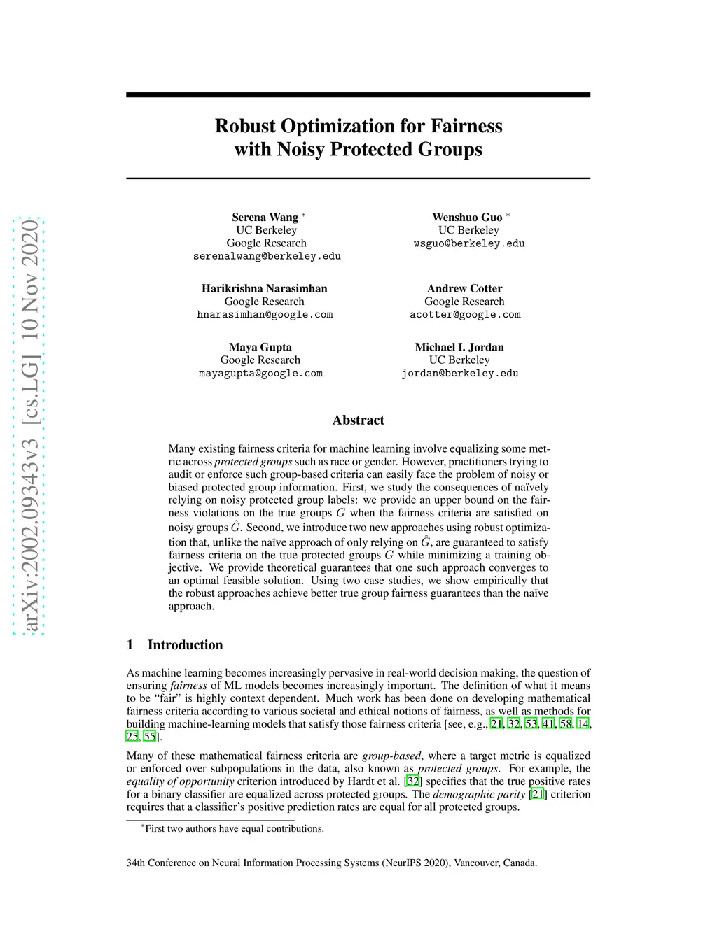 Many existing fairness criteria for machine learning involve equalizing some metric across protected groups such as race or gender. However, practitioners trying to audit or enforce such group-based criteria can easily face the problem of noisy or biased protected group information. First, we study the consequences of naively relying on noisy protected group labels: we provide an upper bound on the fairness violations on the true groups G when the fairness criteria are satisfied on noisy groups . Second, we introduce two new approaches using robust optimization that, unlike the naive approach of only relying on , are guaranteed to satisfy fairness criteria on the true protected groups G while minimizing a training objective. We provide theoretical guarantees that one such approach converges to an optimal feasible solution. Using two case studies, we show empirically that the robust approaches achieve better true group fairness guarantees than the naive approach.