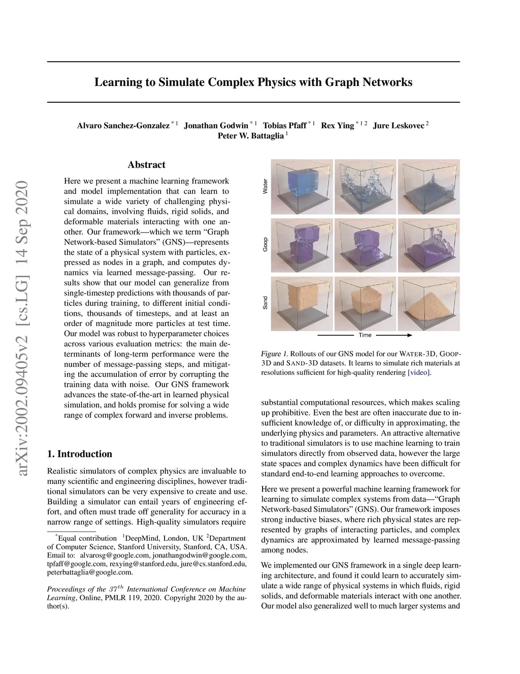 Here we present a general framework for learning simulation, and provide a single model implementation that yields state-of-the-art performance across a variety of challenging physical domains, involving fluids, rigid solids, and deformable materials interacting with one another. Our framework---which we term "Graph Network-based Simulators" (GNS)---represents the state of a physical system with particles, expressed as nodes in a graph, and computes dynamics via learned message-passing. Our results show that our model can generalize from single-timestep predictions with thousands of particles during training, to different initial conditions, thousands of timesteps, and at least an order of magnitude more particles at test time. Our model was robust to hyperparameter choices across various evaluation metrics: the main determinants of long-term performance were the number of message-passing steps, and mitigating the accumulation of error by corrupting the training data with noise. Our GNS framework is the most accurate general-purpose learned physics simulator to date, and holds promise for solving a wide range of complex forward and inverse problems.