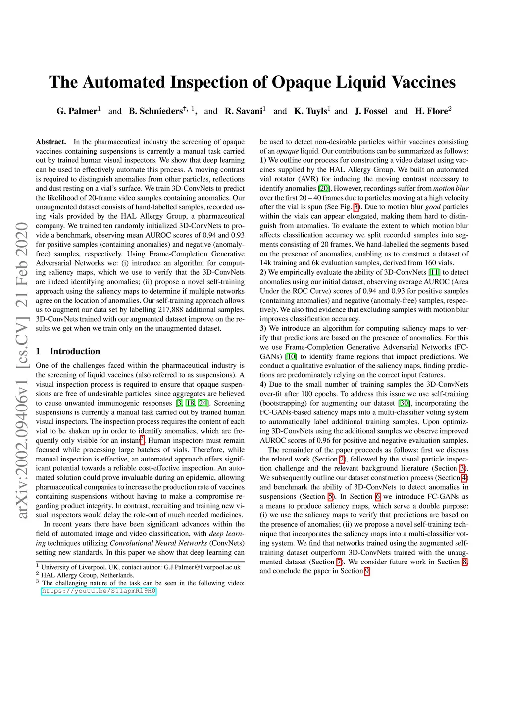 In the pharmaceutical industry the screening of opaque vaccines containing suspensions is currently a manual task carried out by trained human visual inspectors. We show that deep learning can be used to effectively automate this process. A moving contrast is required to distinguish anomalies from other particles, reflections and dust resting on a vial's surface. We train 3D-ConvNets to predict the likelihood of 20-frame video samples containing anomalies. Our unaugmented dataset consists of hand-labelled samples, recorded using vials provided by the HAL Allergy Group, a pharmaceutical company. We trained ten randomly initialized 3D-ConvNets to provide a benchmark, observing mean AUROC scores of 0.94 and 0.93 for positive samples (containing anomalies) and negative (anomaly-free) samples, respectively. Using Frame-Completion Generative Adversarial Networks we: (i) introduce an algorithm for computing saliency maps, which we use to verify that the 3D-ConvNets are indeed identifying anomalies; (ii) propose a novel self-training approach using the saliency maps to determine if multiple networks agree on the location of anomalies. Our self-training approach allows us to augment our data set by labelling 217,888 additional samples. 3D-ConvNets trained with our augmented dataset improve on the results we get when we train only on the unaugmented dataset.