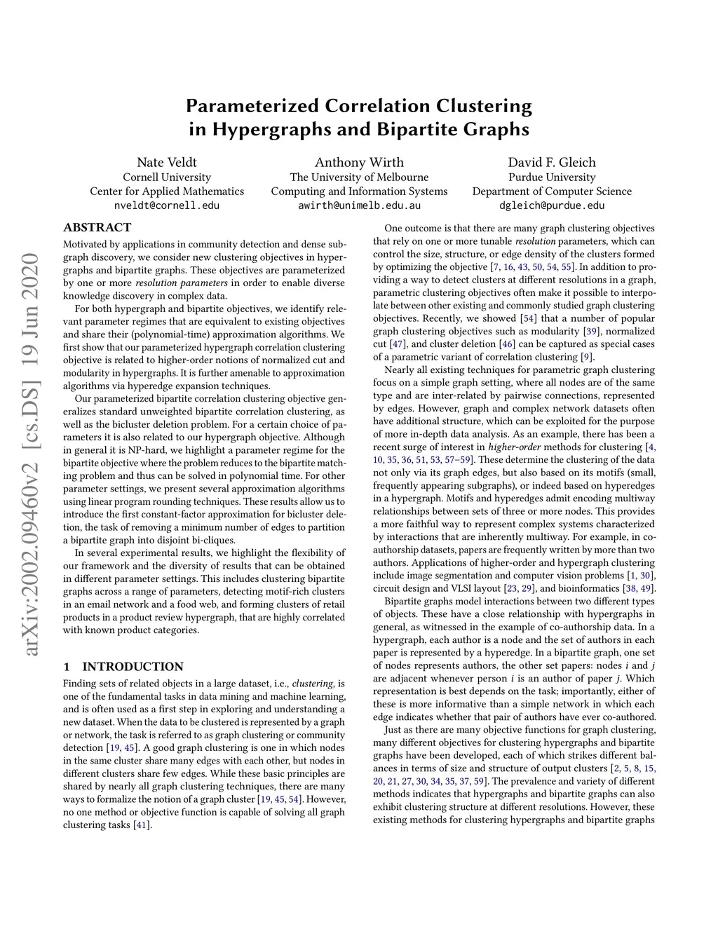 Motivated by applications in community detection and dense subgraph discovery, we consider new clustering objectives in hypergraphs and bipartite graphs. These objectives are parameterized by one or more resolution parameters in order to enable diverse knowledge discovery in complex data. For both hypergraph and bipartite objectives, we identify parameter regimes that are equivalent to existing objectives and share their (polynomial-time) approximation algorithms. We first show that our parameterized hypergraph correlation clustering objective is related to higher-order notions of normalized cut and modularity in hypergraphs. It is further amenable to approximation algorithms via hyperedge expansion techniques. Our parameterized bipartite correlation clustering objective generalizes standard unweighted bipartite correlation clustering, as well as bicluster deletion. For a certain choice of parameters it is also related to our hypergraph objective. Although in general it is NP-hard, we highlight a parameter regime for the bipartite objective where the problem reduces to the bipartite matching problem and thus can be solved in polynomial time. For other parameter settings, we present approximation algorithms using linear program rounding techniques. These results allow us to introduce the first constant-factor approximation for bicluster deletion, the task of removing a minimum number of edges to partition a bipartite graph into disjoint bi-cliques. In several experimental results, we highlight the flexibility of our framework and the diversity of results that can be obtained in different parameter settings. This includes clustering bipartite graphs across a range of parameters, detecting motif-rich clusters in an email network and a food web, and forming clusters of retail products in a product review hypergraph, that are highly correlated with known product categories.