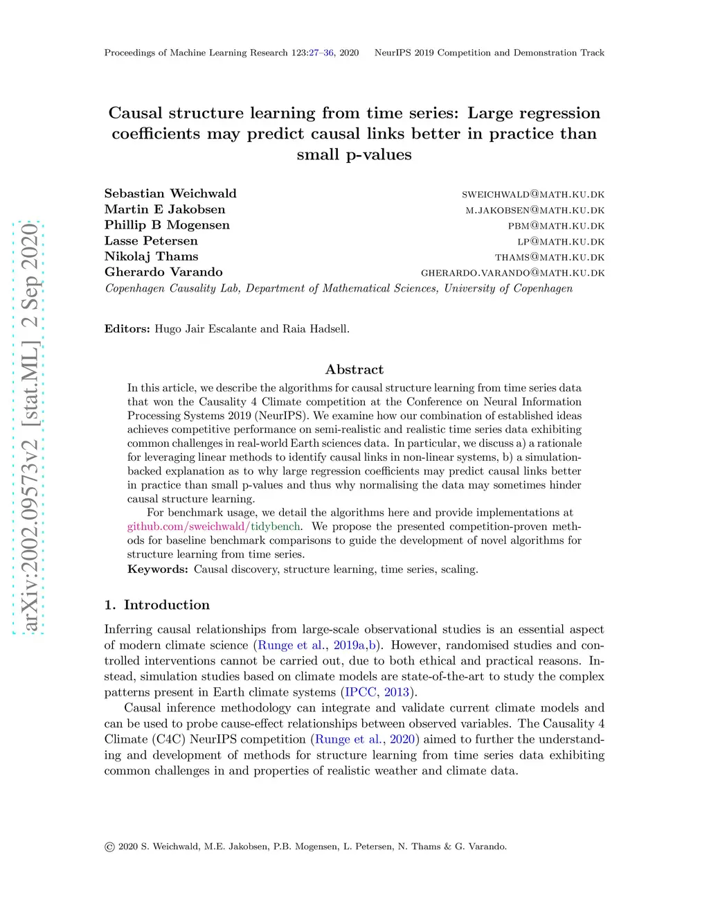 In this article, we describe the algorithms for causal structure learning from time series data that won the Causality 4 Climate competition at the Conference on Neural Information Processing Systems 2019 (NeurIPS). We examine how our combination of established ideas achieves competitive performance on semi-realistic and realistic time series data exhibiting common challenges in real-world Earth sciences data. In particular, we discuss a) a rationale for leveraging linear methods to identify causal links in non-linear systems, b) a simulation-backed explanation as to why large regression coefficients may predict causal links better in practice than small p-values and thus why normalising the data may sometimes hinder causal structure learning. For benchmark usage, we detail the algorithms here and provide implementations at https://github.com/sweichwald/tidybench . We propose the presented competition-proven methods for baseline benchmark comparisons to guide the development of novel algorithms for structure learning from time series.