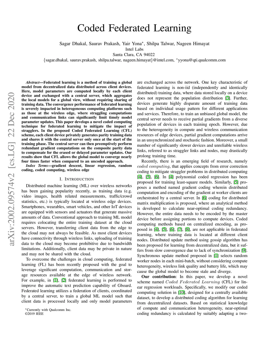 Federated learning is a method of training a global model from decentralized data distributed across client devices. Here, model parameters are computed locally by each client device and exchanged with a central server, which aggregates the local models for a global view, without requiring sharing of training data. The convergence performance of federated learning is severely impacted in heterogeneous computing platforms such as those at the wireless edge, where straggling computations and communication links can significantly limit timely model parameter updates. This paper develops a novel coded computing technique for federated learning to mitigate the impact of stragglers. In the proposed Coded Federated Learning (CFL) scheme, each client device privately generates parity training data and shares it with the central server only once at the start of the training phase. The central server can then preemptively perform redundant gradient computations on the composite parity data to compensate for the erased or delayed parameter updates. Our results show that CFL allows the global model to converge nearly four times faster when compared to an uncoded approach