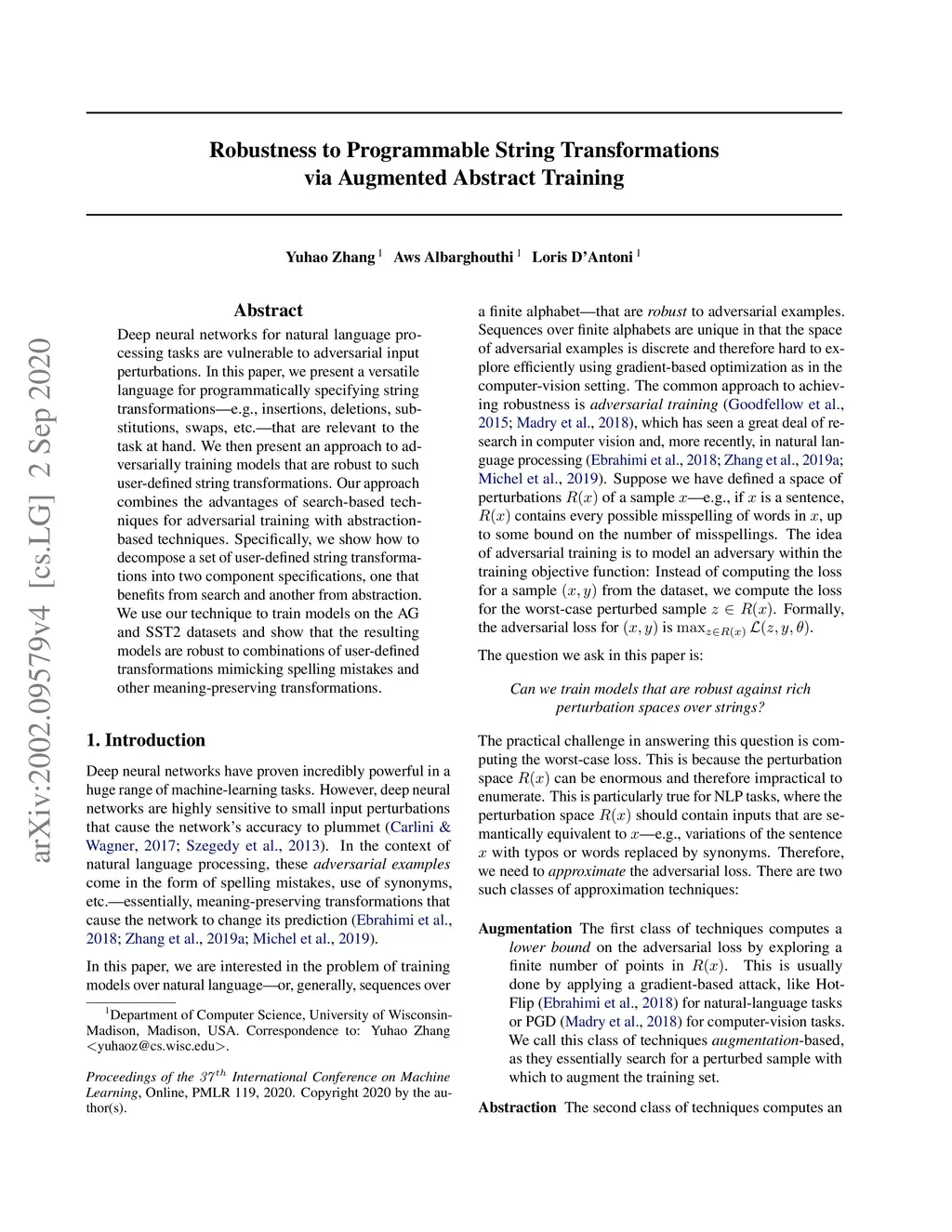 Deep neural networks for natural language processing tasks are vulnerable to adversarial input perturbations. In this paper, we present a versatile language for programmatically specifying string transformations -- e.g., insertions, deletions, substitutions, swaps, etc. -- that are relevant to the task at hand. We then present an approach to adversarially training models that are robust to such user-defined string transformations. Our approach combines the advantages of search-based techniques for adversarial training with abstraction-based techniques. Specifically, we show how to decompose a set of user-defined string transformations into two component specifications, one that benefits from search and another from abstraction. We use our technique to train models on the AG and SST2 datasets and show that the resulting models are robust to combinations of user-defined transformations mimicking spelling mistakes and other meaning-preserving transformations.