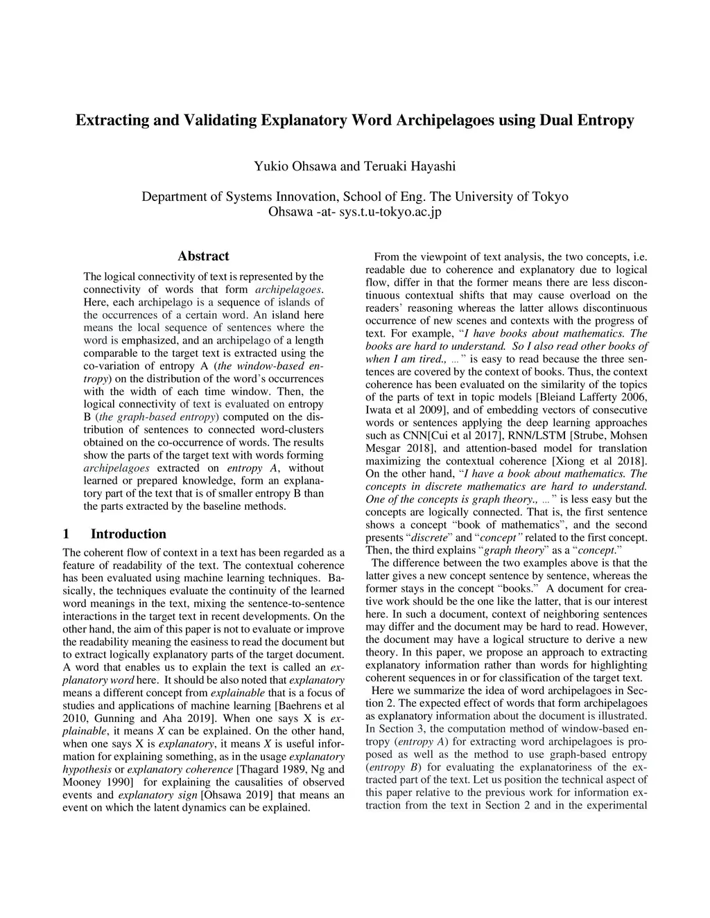 The logical connectivity of text is represented by the connectivity of words that form archipelagoes. Here, each archipelago is a sequence of islands of the occurrences of a certain word. An island here means the local sequence of sentences where the word is emphasized, and an archipelago of a length comparable to the target text is extracted using the co-variation of entropy A (the window-based entropy) on the distribution of the word's occurrences with the width of each time window. Then, the logical connectivity of text is evaluated on entropy B (the graph-based entropy) computed on the distribution of sentences to connected word-clusters obtained on the co-occurrence of words. The results show the parts of the target text with words forming archipelagoes extracted on entropy A, without learned or prepared knowledge, form an explanatory part of the text that is of smaller entropy B than the parts extracted by the baseline methods.