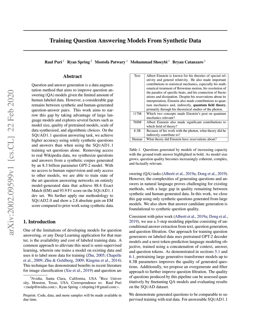 Question and answer generation is a data augmentation method that aims to improve question answering (QA) models given the limited amount of human labeled data. However, a considerable gap remains between synthetic and human-generated question-answer pairs. This work aims to narrow this gap by taking advantage of large language models and explores several factors such as model size, quality of pretrained models, scale of data synthesized, and algorithmic choices. On the SQuAD1.1 question answering task, we achieve higher accuracy using solely synthetic questions and answers than when using the SQuAD1.1 training set questions alone. Removing access to real Wikipedia data, we synthesize questions and answers from a synthetic corpus generated by an 8.3 billion parameter GPT-2 model. With no access to human supervision and only access to other models, we are able to train state of the art question answering networks on entirely model-generated data that achieve 88.4 Exact Match (EM) and 93.9 F1 score on the SQuAD1.1 dev set. We further apply our methodology to SQuAD2.0 and show a 2.8 absolute gain on EM score compared to prior work using synthetic data.