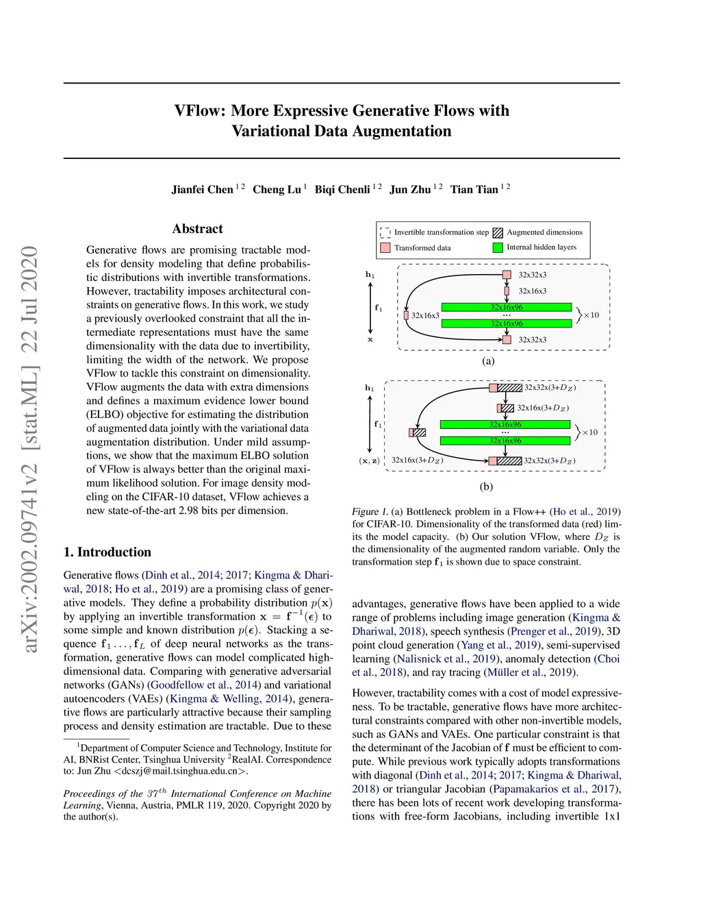 Generative flows are promising tractable models for density modeling that define probabilistic distributions with invertible transformations. However, tractability imposes architectural constraints on generative flows, making them less expressive than other types of generative models. In this work, we study a previously overlooked constraint that all the intermediate representations must have the same dimensionality with the original data due to invertibility, limiting the width of the network. We tackle this constraint by augmenting the data with some extra dimensions and jointly learning a generative flow for augmented data as well as the distribution of augmented dimensions under a variational inference framework. Our approach, VFlow, is a generalization of generative flows and therefore always performs better. Combining with existing generative flows, VFlow achieves a new state-of-the-art 2.98 bits per dimension on the CIFAR-10 dataset and is more compact than previous models to reach similar modeling quality.