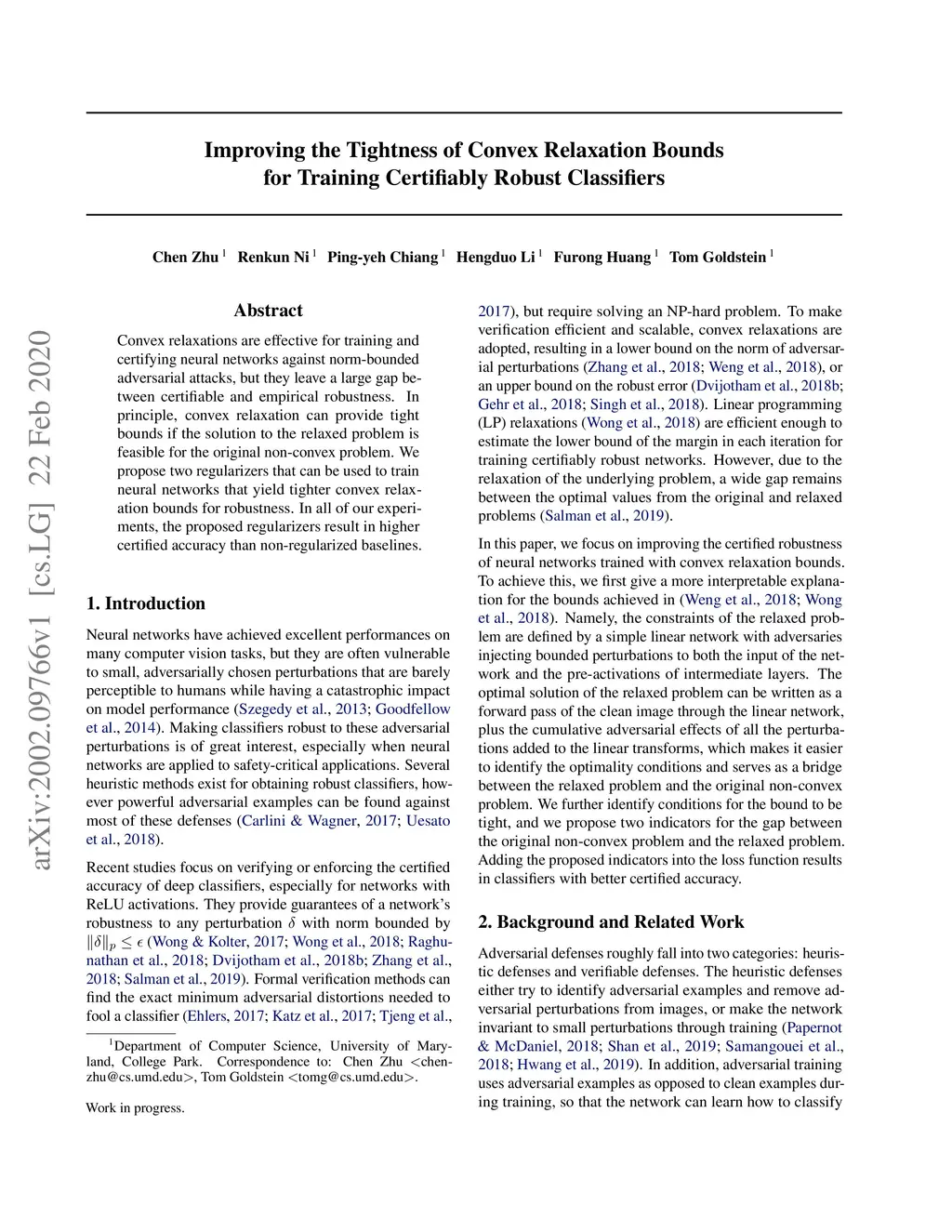 Convex relaxations are effective for training and certifying neural networks against norm-bounded adversarial attacks, but they leave a large gap between certifiable and empirical robustness. In principle, convex relaxation can provide tight bounds if the solution to the relaxed problem is feasible for the original non-convex problem. We propose two regularizers that can be used to train neural networks that yield tighter convex relaxation bounds for robustness. In all of our experiments, the proposed regularizers result in higher certified accuracy than non-regularized baselines.