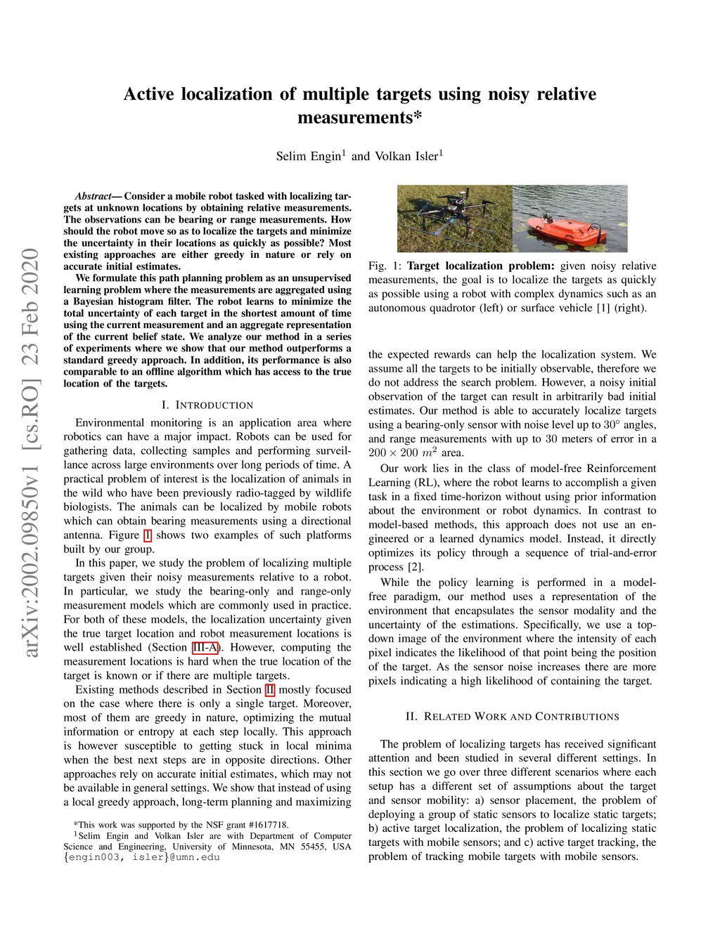 Consider a mobile robot tasked with localizing targets at unknown locations by obtaining relative measurements. The observations can be bearing or range measurements. How should the robot move so as to localize the targets and minimize the uncertainty in their locations as quickly as possible? Most existing approaches are either greedy in nature or rely on accurate initial estimates. We formulate this path planning problem as an unsupervised learning problem where the measurements are aggregated using a Bayesian histogram filter. The robot learns to minimize the total uncertainty of each target in the shortest amount of time using the current measurement and an aggregate representation of the current belief state. We analyze our method in a series of experiments where we show that our method outperforms a standard greedy approach. In addition, its performance is also comparable to an offline algorithm which has access to the true location of the targets.