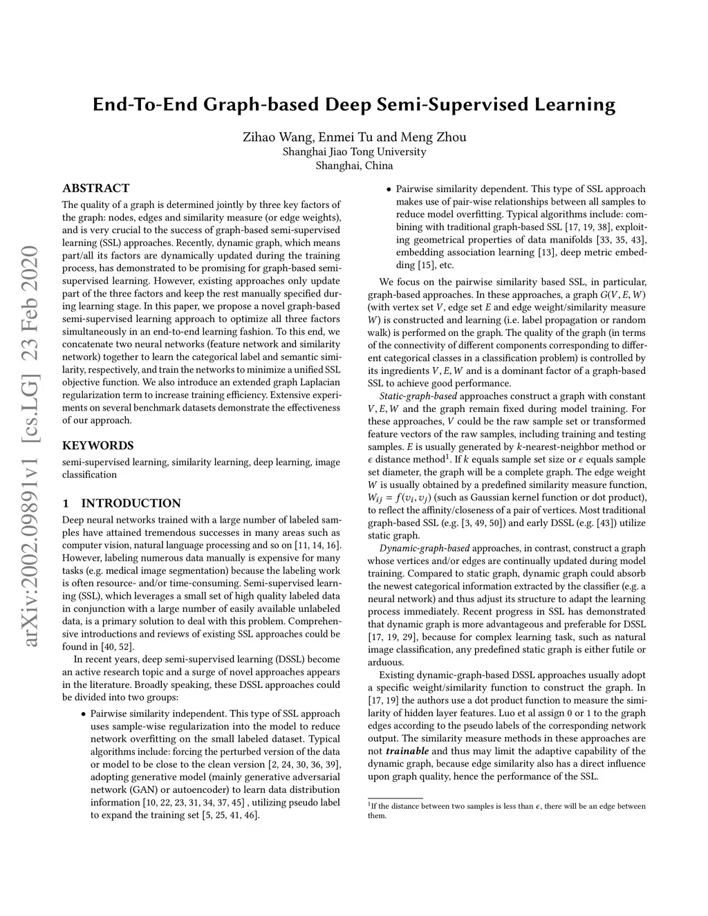 The quality of a graph is determined jointly by three key factors of the graph: nodes, edges and similarity measure (or edge weights), and is very crucial to the success of graph-based semi-supervised learning (SSL) approaches. Recently, dynamic graph, which means part/all its factors are dynamically updated during the training process, has demonstrated to be promising for graph-based semi-supervised learning. However, existing approaches only update part of the three factors and keep the rest manually specified during the learning stage. In this paper, we propose a novel graph-based semi-supervised learning approach to optimize all three factors simultaneously in an end-to-end learning fashion. To this end, we concatenate two neural networks (feature network and similarity network) together to learn the categorical label and semantic similarity, respectively, and train the networks to minimize a unified SSL objective function. We also introduce an extended graph Laplacian regularization term to increase training efficiency. Extensive experiments on several benchmark datasets demonstrate the effectiveness of our approach.