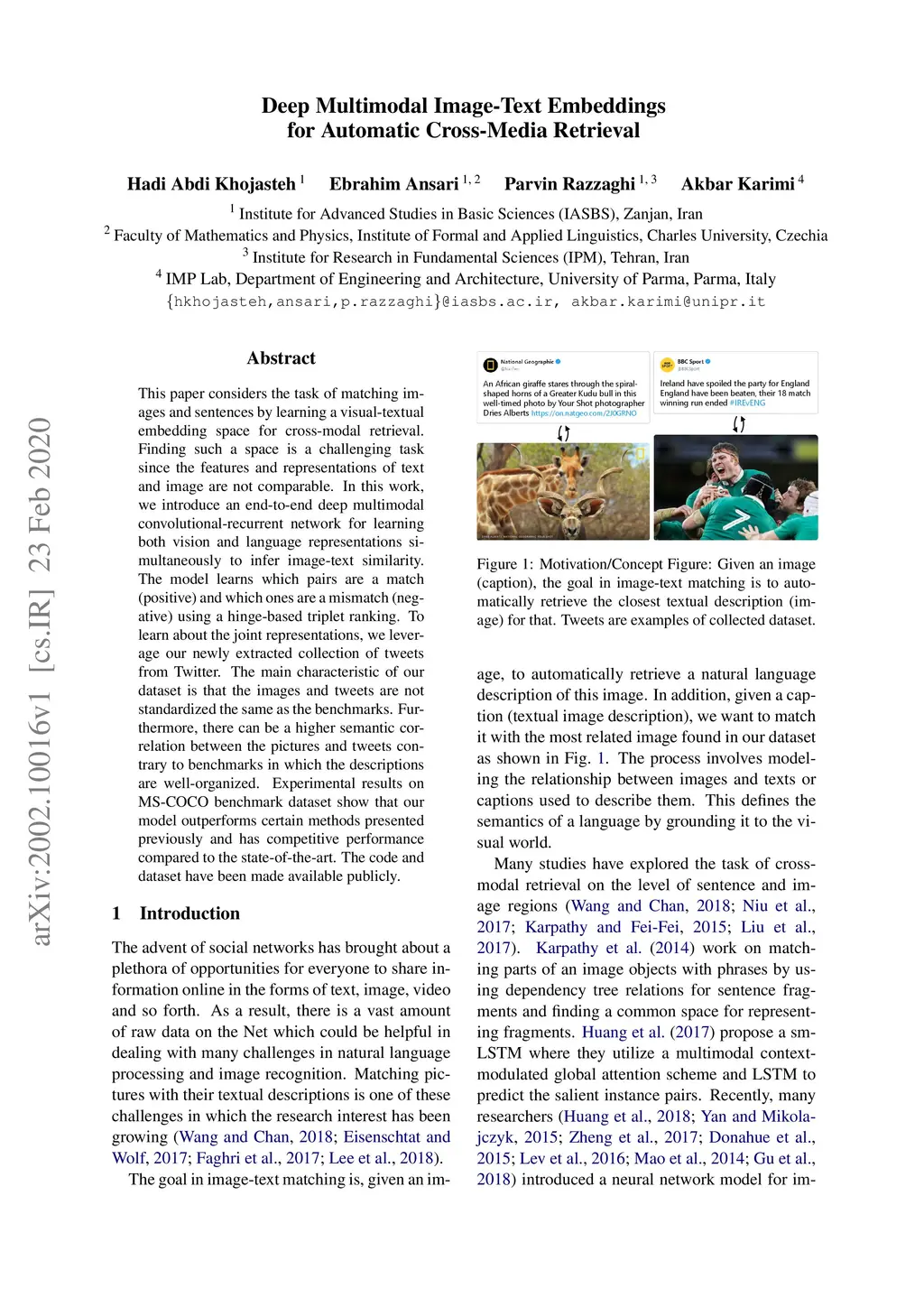 This paper considers the task of matching images and sentences by learning a visual-textual embedding space for cross-modal retrieval. Finding such a space is a challenging task since the features and representations of text and image are not comparable. In this work, we introduce an end-to-end deep multimodal convolutional-recurrent network for learning both vision and language representations simultaneously to infer image-text similarity. The model learns which pairs are a match (positive) and which ones are a mismatch (negative) using a hinge-based triplet ranking. To learn about the joint representations, we leverage our newly extracted collection of tweets from Twitter. The main characteristic of our dataset is that the images and tweets are not standardized the same as the benchmarks. Furthermore, there can be a higher semantic correlation between the pictures and tweets contrary to benchmarks in which the descriptions are well-organized. Experimental results on MS-COCO benchmark dataset show that our model outperforms certain methods presented previously and has competitive performance compared to the state-of-the-art. The code and dataset have been made available publicly.