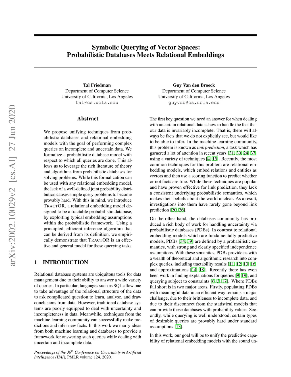 To deal with increasing amounts of uncertainty and incompleteness in relational data, we propose unifying techniques from probabilistic databases and relational embedding models. We use probabilistic databases as our formalism to define the probabilistic model with respect to which all queries are done. This allows us to leverage the rich literature of theory and algorithms from probabilistic databases for solving problems. While this formalization can be used with any relational embedding model, the lack of a well defined joint probability distribution causes simple problems to become provably hard. With this in mind, we introduce \TO, a relational embedding model designed in terms of probabilistic databases to exploit typical embedding assumptions within the probabilistic framework. Using principled, efficient inference algorithms that can be derived from its definition, we empirically demonstrate that \TOs is an effective and general model for these tasks.