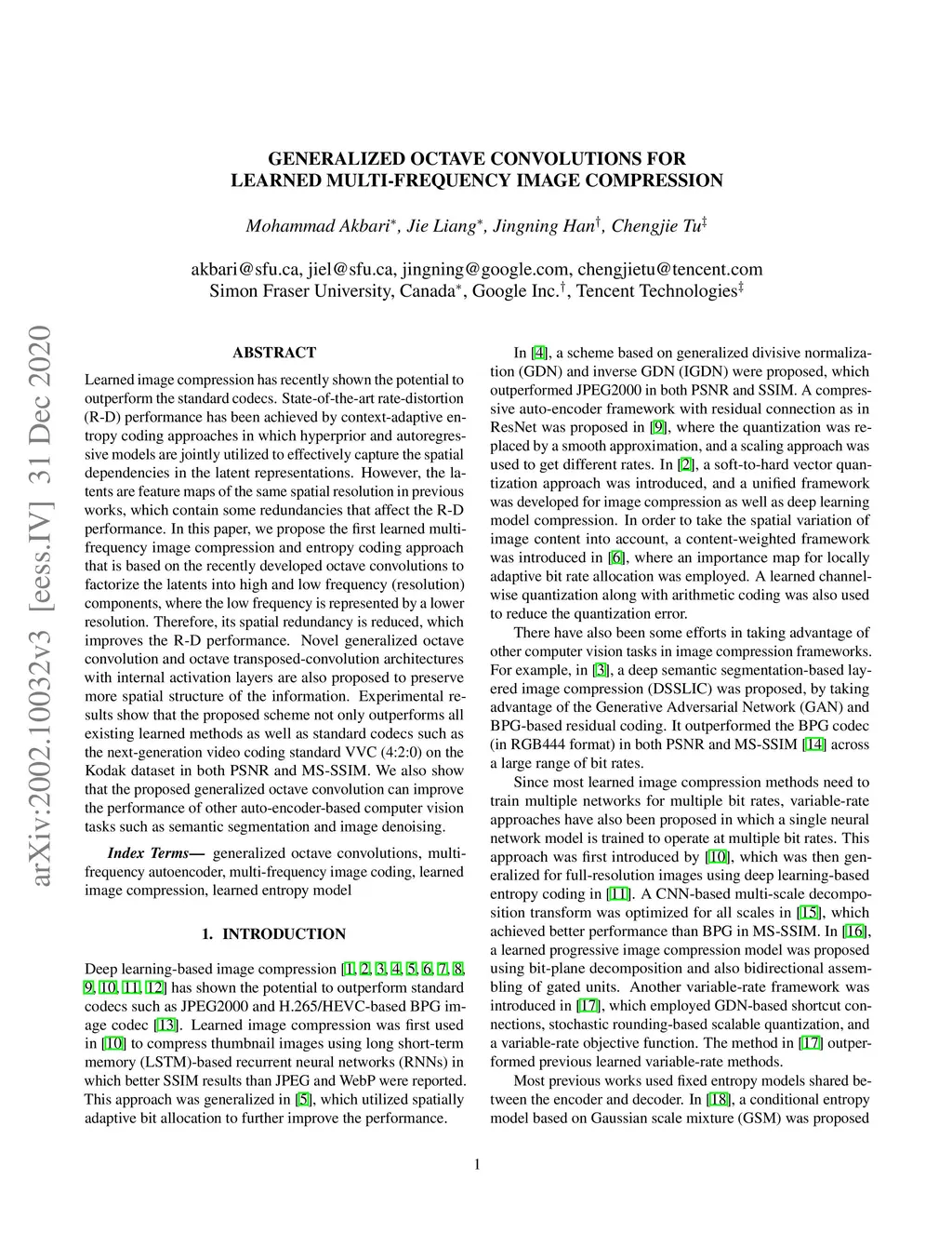 Learned image compression has recently shown the potential to outperform the standard codecs. State-of-the-art rate-distortion (R-D) performance has been achieved by context-adaptive entropy coding approaches in which hyperprior and autoregressive models are jointly utilized to effectively capture the spatial dependencies in the latent representations. However, the latents are feature maps of the same spatial resolution in previous works, which contain some redundancies that affect the R-D performance. In this paper, we propose the first learned multi-frequency image compression and entropy coding approach that is based on the recently developed octave convolutions to factorize the latents into high and low frequency (resolution) components, where the low frequency is represented by a lower resolution. Therefore, its spatial redundancy is reduced, which improves the R-D performance. Novel generalized octave convolution and octave transposed-convolution architectures with internal activation layers are also proposed to preserve more spatial structure of the information. Experimental results show that the proposed scheme not only outperforms all existing learned methods as well as standard codecs such as the next-generation video coding standard VVC (4:2:0) on the Kodak dataset in both PSNR and MS-SSIM. We also show that the proposed generalized octave convolution can improve the performance of other auto-encoder-based computer vision tasks such as semantic segmentation and image denoising.