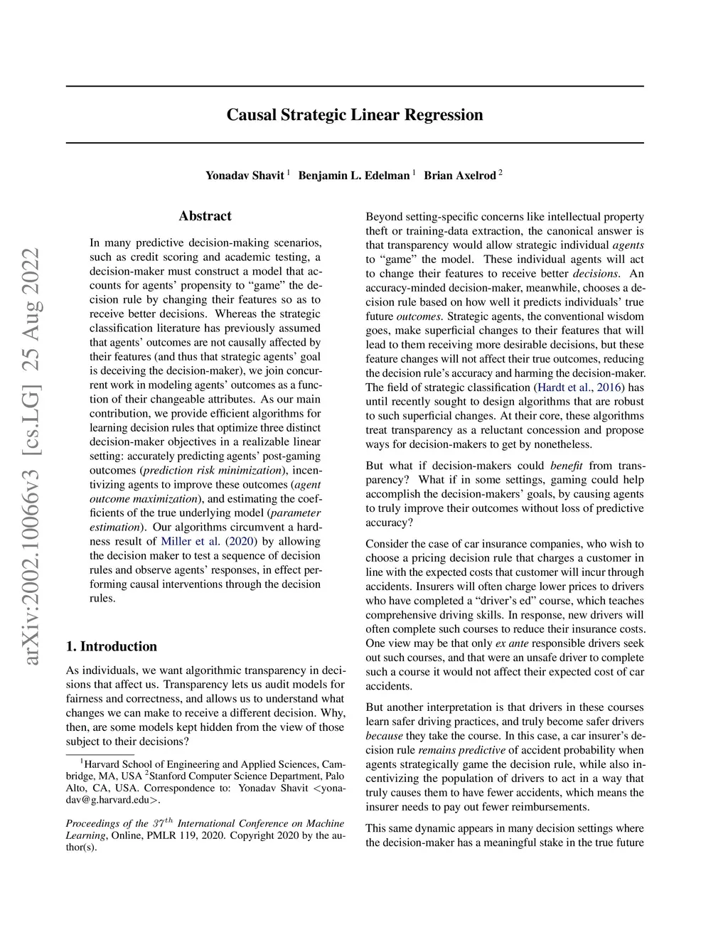In many predictive decision-making scenarios, such as credit scoring and academic testing, a decision-maker must construct a model that accounts for agents' propensity to "game" the decision rule by changing their features so as to receive better decisions. Whereas the strategic classification literature has previously assumed that agents' outcomes are not causally affected by their features (and thus that strategic agents' goal is deceiving the decision-maker), we join concurrent work in modeling agents' outcomes as a function of their changeable attributes. As our main contribution, we provide efficient algorithms for learning decision rules that optimize three distinct decision-maker objectives in a realizable linear setting: accurately predicting agents' post-gaming outcomes (prediction risk minimization), incentivizing agents to improve these outcomes (agent outcome maximization), and estimating the coefficients of the true underlying model (parameter estimation). Our algorithms circumvent a hardness result of Miller et al. (2020) by allowing the decision maker to test a sequence of decision rules and observe agents' responses, in effect performing causal interventions through the decision rules.