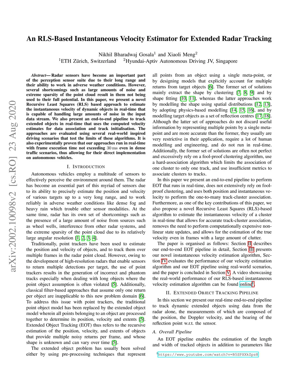 Radar sensors have become an important part of the perception sensor suite due to their long range and their ability to work in adverse weather conditions. However, several shortcomings such as large amounts of noise and extreme sparsity of the point cloud result in them not being used to their full potential. In this paper, we present a novel Recursive Least Squares (RLS) based approach to estimate the instantaneous velocity of dynamic objects in real-time that is capable of handling large amounts of noise in the input data stream. We also present an end-to-end pipeline to track extended objects in real-time that uses the computed velocity estimates for data association and track initialisation. The approaches are evaluated using several real-world inspired driving scenarios that test the limits of these algorithms. It is also experimentally proven that our approaches run in real-time with frame execution time not exceeding 30 ms even in dense traffic scenarios, thus allowing for their direct implementation on autonomous vehicles.