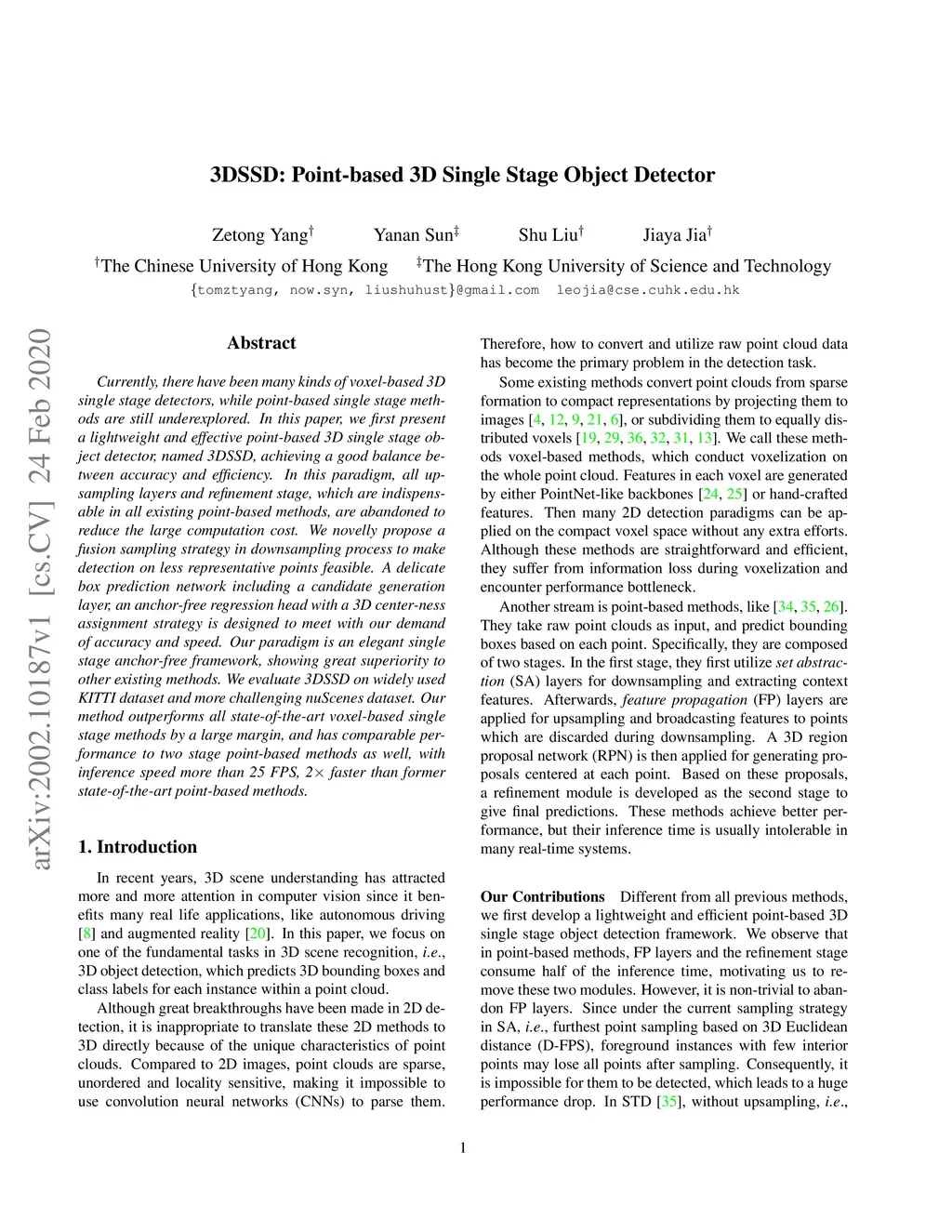 Currently, there have been many kinds of voxel-based 3D single stage detectors, while point-based single stage methods are still underexplored. In this paper, we first present a lightweight and effective point-based 3D single stage object detector, named 3DSSD, achieving a good balance between accuracy and efficiency. In this paradigm, all upsampling layers and refinement stage, which are indispensable in all existing point-based methods, are abandoned to reduce the large computation cost. We novelly propose a fusion sampling strategy in downsampling process to make detection on less representative points feasible. A delicate box prediction network including a candidate generation layer, an anchor-free regression head with a 3D center-ness assignment strategy is designed to meet with our demand of accuracy and speed. Our paradigm is an elegant single stage anchor-free framework, showing great superiority to other existing methods. We evaluate 3DSSD on widely used KITTI dataset and more challenging nuScenes dataset. Our method outperforms all state-of-the-art voxel-based single stage methods by a large margin, and has comparable performance to two stage point-based methods as well, with inference speed more than 25 FPS, 2x faster than former state-of-the-art point-based methods.