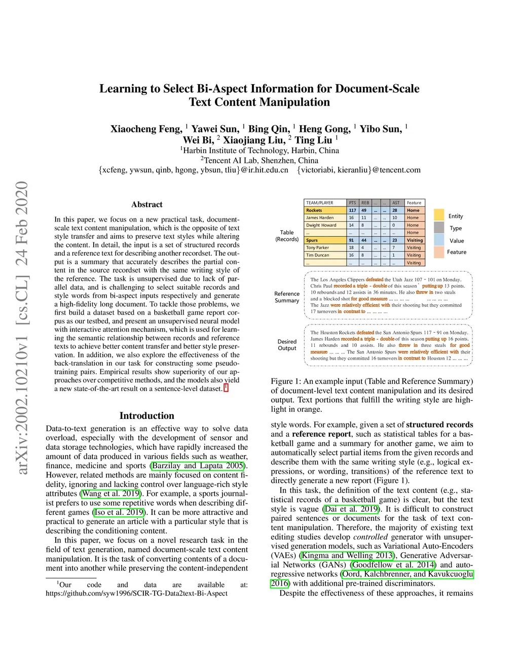 In this paper, we focus on a new practical task, document-scale text content manipulation, which is the opposite of text style transfer and aims to preserve text styles while altering the content. In detail, the input is a set of structured records and a reference text for describing another recordset. The output is a summary that accurately describes the partial content in the source recordset with the same writing style of the reference. The task is unsupervised due to lack of parallel data, and is challenging to select suitable records and style words from bi-aspect inputs respectively and generate a high-fidelity long document. To tackle those problems, we first build a dataset based on a basketball game report corpus as our testbed, and present an unsupervised neural model with interactive attention mechanism, which is used for learning the semantic relationship between records and reference texts to achieve better content transfer and better style preservation. In addition, we also explore the effectiveness of the back-translation in our task for constructing some pseudo-training pairs. Empirical results show superiority of our approaches over competitive methods, and the models also yield a new state-of-the-art result on a sentence-level dataset.