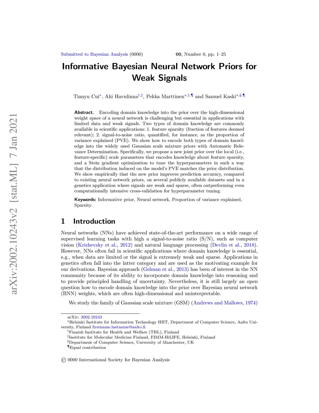 Encoding domain knowledge into the prior over the high-dimensional weight space of a neural network is challenging but essential in applications with limited data and weak signals. Two types of domain knowledge are commonly available in scientific applications: 1. feature sparsity (fraction of features deemed relevant); 2. signal-to-noise ratio, quantified, for instance, as the proportion of variance explained (PVE). We show how to encode both types of domain knowledge into the widely used Gaussian scale mixture priors with Automatic Relevance Determination. Specifically, we propose a new joint prior over the local (i.e., feature-specific) scale parameters that encodes knowledge about feature sparsity, and a Stein gradient optimization to tune the hyperparameters in such a way that the distribution induced on the model's PVE matches the prior distribution. We show empirically that the new prior improves prediction accuracy, compared to existing neural network priors, on several publicly available datasets and in a genetics application where signals are weak and sparse, often outperforming even computationally intensive cross-validation for hyperparameter tuning.