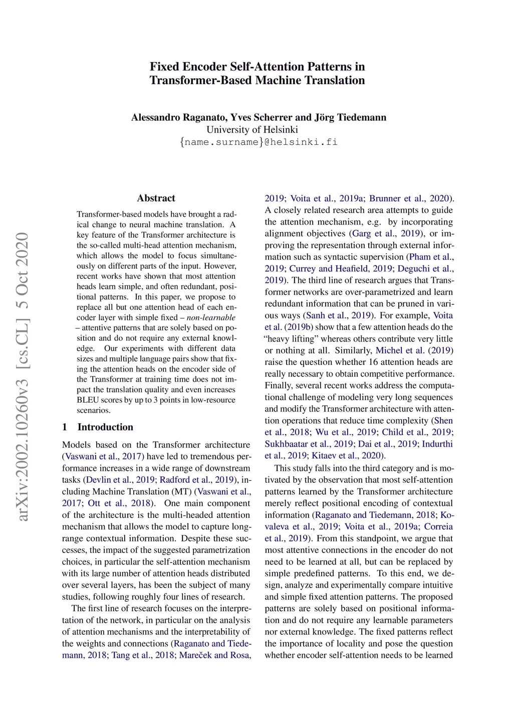 Fixed Encoder Self-Attention Patterns in Transformer-Based Machine Translation